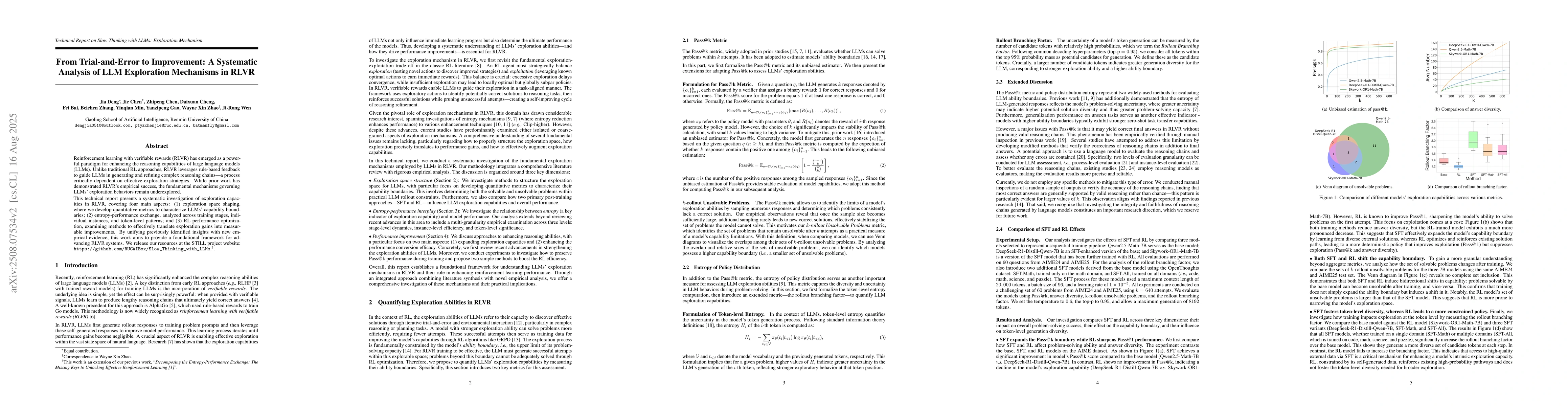 This research systematically analyzes exploration mechanisms in RLVR, a method using rule-based feedback to improve large language models' reasoning. It introduces metrics for LLMs' capability boundaries, examines entropy-performance trade-offs, and explores optimizing RL performance. The goal is to establish a foundation for enhancing RLVR systems.