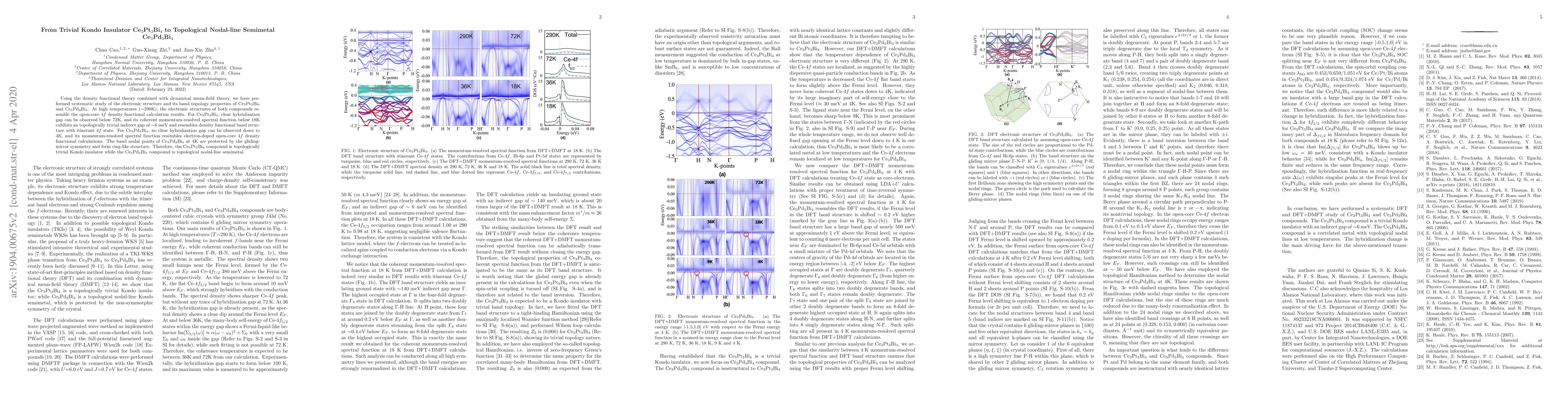 This research explores the electronic structures of Ce$_3$Pt$_3$Bi$_4$ and Ce$_3$Pd$_3$Bi$_4$ using density functional theory and dynamical mean-field theory. Ce$_3$Pt$_3$Bi$_4$ exhibits a topologically trivial Kondo insulator behavior, while Ce$_3$Pd$_3$Bi$_4$ displays topological nodal-line semimetal characteristics with gliding-mirror symmetry protecting its band nodal points.