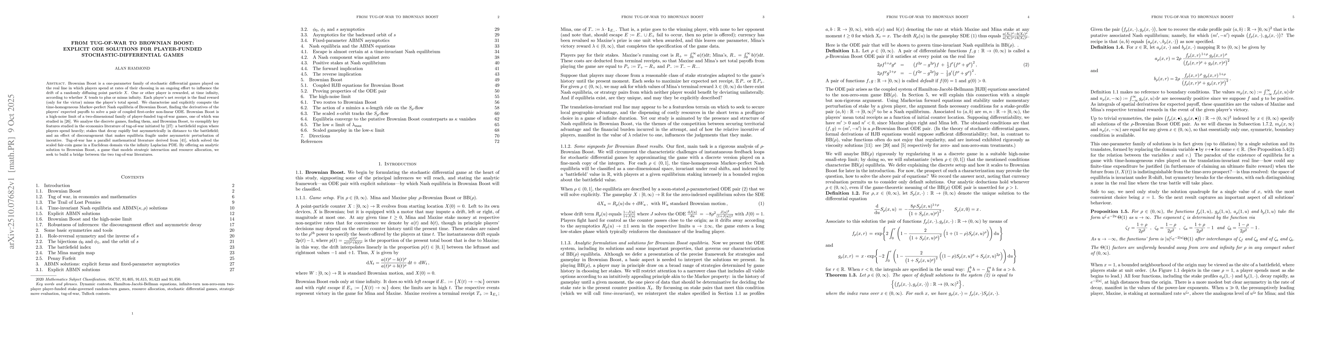 Brownian Boost is a one-parameter family of stochastic differential games played on the real line in which players spend at rates of their choosing in an ongoing effort to influence the drift of a randomly diffusing point particle~$X$. One or other player is rewarded, at time infinity, according to whether~$X$ tends to plus or minus infinity. Each player's net receipt is the final reward (only for the victor) minus the player's total spend. We characterise and explicitly compute the time-homogeneous Markov-perfect Nash equilibria of Brownian Boost, finding the derivatives of the players' expected payoffs to solve a pair of coupled first-order non-linear ODE. Brownian Boost is a high-noise limit of a two-dimensional family of player-funded tug-of-war games, one of which was studied in~\cite{LostPennies}. We analyse the discrete games, finding them, and Brownian Boost, to exemplify key features studied in the economics literature of tug-of-war initiated by~\cite{HarrisVickers87}: a battlefield region where players spend heavily; stakes that decay rapidly but asymmetrically in distance to the battlefield; and an effect of discouragement that makes equilibria fragile under asymmetric perturbation of incentive. Tug-of-war has a parallel mathematical literature derived from~\cite{PSSW09}, which solved the scaled fair-coin game in a Euclidean domain via the infinity Laplacian PDE. By offering an analytic solution to Brownian Boost, a game that models strategic interaction and resource allocation, we seek to build a bridge between the two tug-of-war literatures.