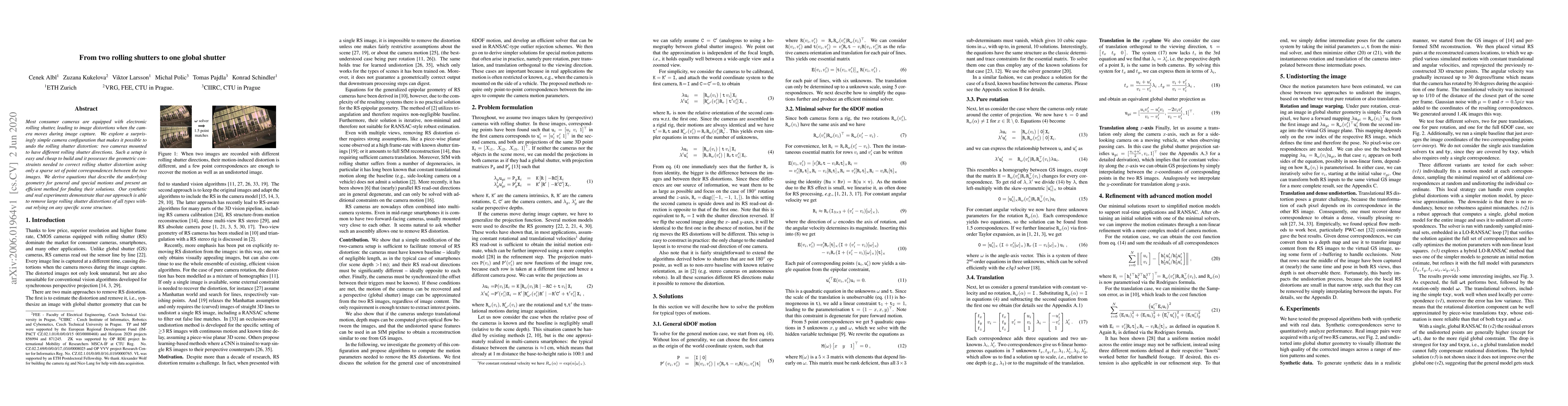 This paper proposes a cost-effective method using two cameras with opposing rolling shutter directions to correct distortions caused by rolling shutters in consumer cameras. The approach leverages geometric constraints and sparse point correspondences to efficiently remove rolling shutter distortions without requiring specific scene structures.