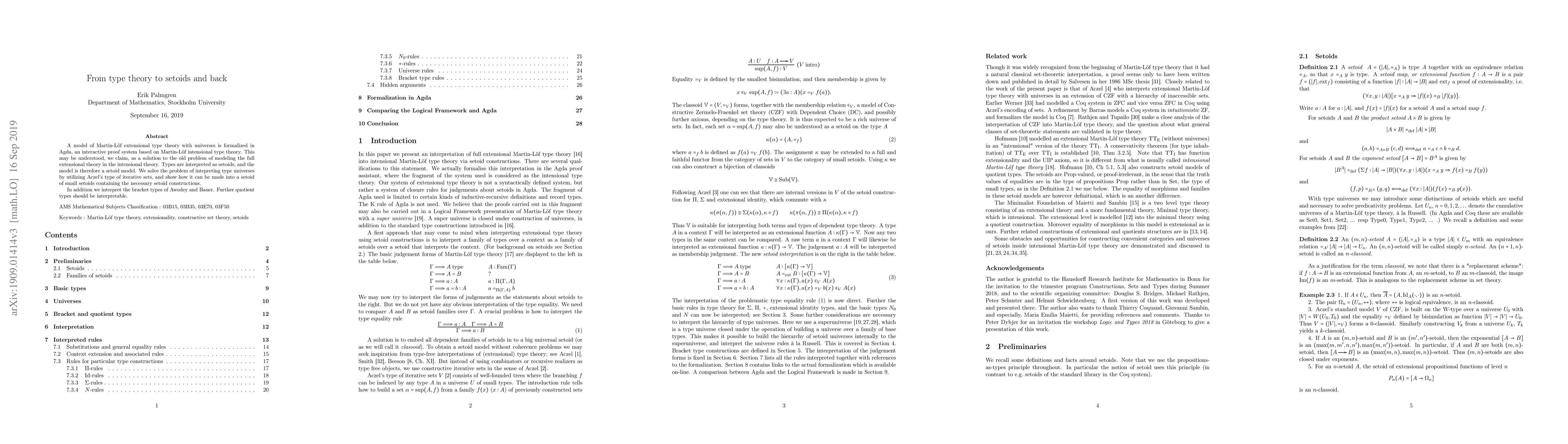 A model of Martin-L\"of extensional type theory with universes is formalized in Agda, an interactive proof system based on Martin-L\"of intensional type theory. This may be understood, we claim, as a solution to the old problem of modelling the full extensional theory in the intensional theory. Types are interpreted as setoids, and the model is therefore a setoid model. We solve the problem of intepreting type universes by utilizing Aczel's type of iterative sets, and show how it can be made into a setoid of small setoids containing the necessary setoid constructions. In addition we interpret the bracket types of Awodey and Bauer. Further quotient types should be interpretable.