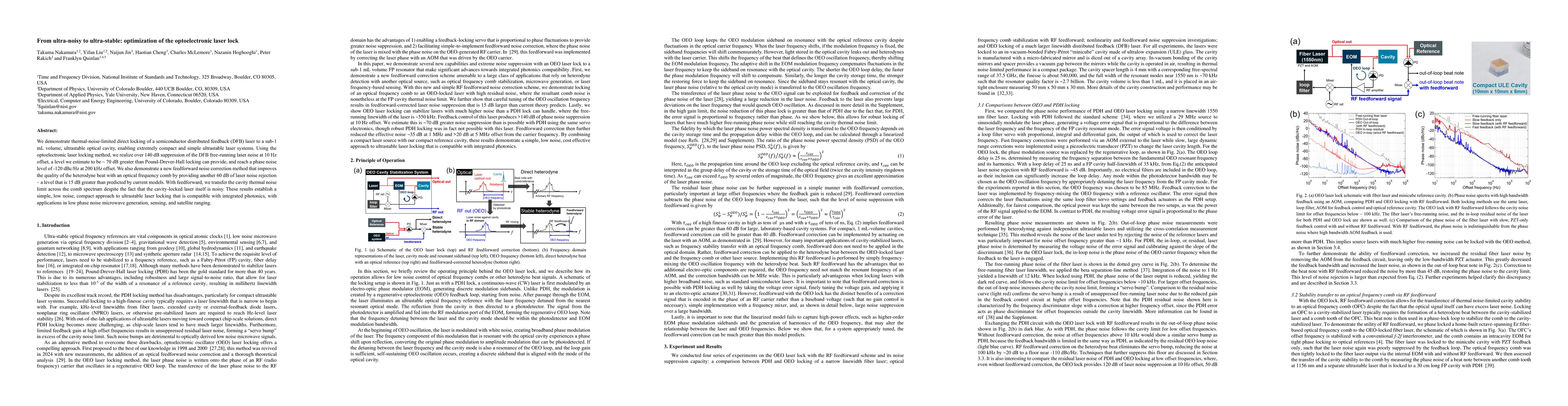 The research employs the optoelectronic laser locking method to stabilize a DFB laser against a sub-1 mL volume ultrastable optical cavity, utilizing feedforward noise correction for enhanced performance.