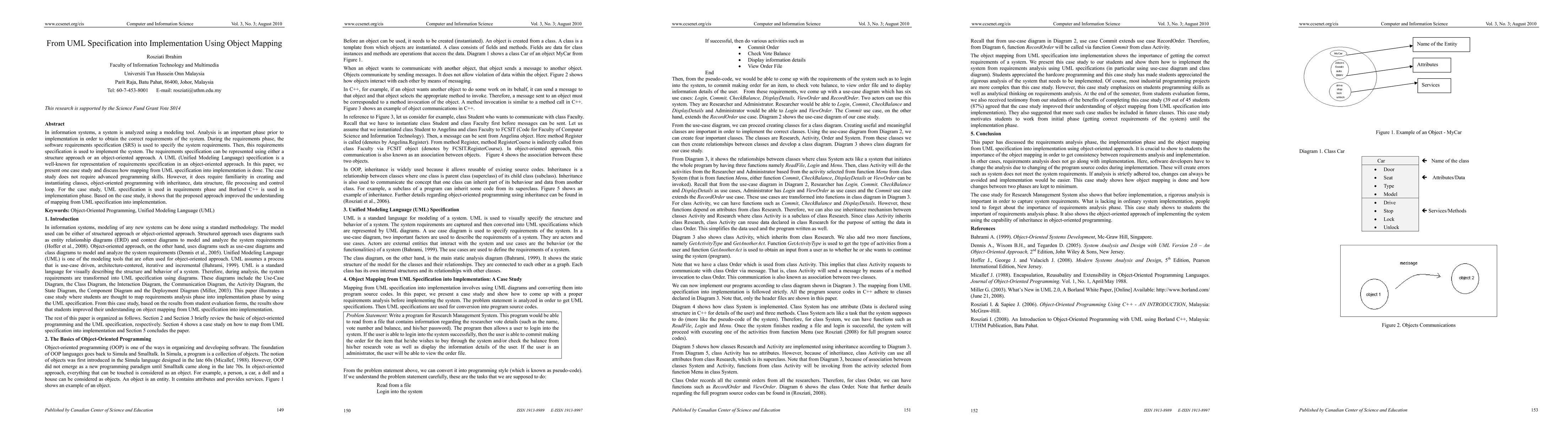 This paper presents a case study demonstrating the mapping of a UML specification into system implementation using Borland C++. It emphasizes understanding object-oriented principles and basic programming skills, showing improved comprehension of the UML to implementation process.