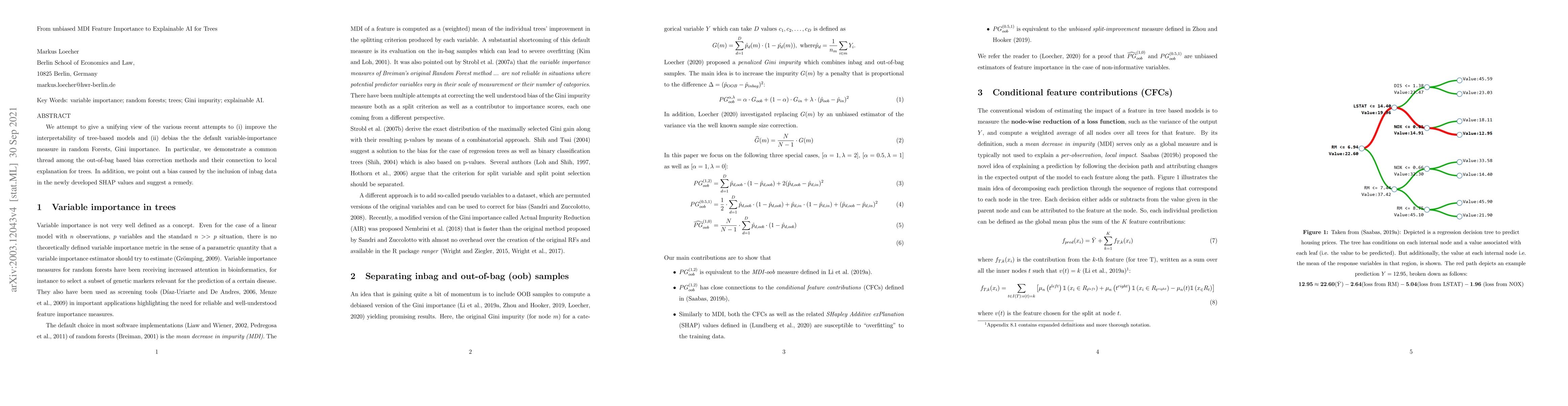This paper aims to improve the interpretability of tree-based models and debias their default variable-importance measure. It highlights a common thread among bias correction methods and identifies an issue with inbag data inclusion in explainable AI algorithms.