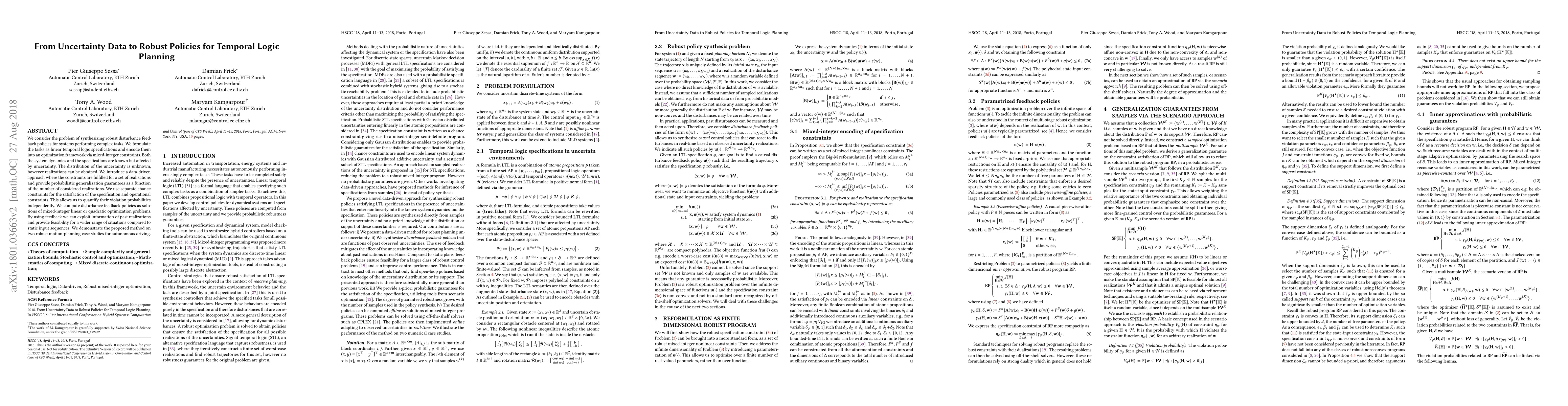 We consider the problem of synthesizing robust disturbance feedback policies for systems performing complex tasks. We formulate the tasks as linear temporal logic specifications and encode them into an optimization framework via mixed-integer constraints. Both the system dynamics and the specifications are known but affected by uncertainty. The distribution of the uncertainty is unknown, however realizations can be obtained. We introduce a data-driven approach where the constraints are fulfilled for a set of realizations and provide probabilistic generalization guarantees as a function of the number of considered realizations. We use separate chance constraints for the satisfaction of the specification and operational constraints. This allows us to quantify their violation probabilities independently. We compute disturbance feedback policies as solutions of mixed-integer linear or quadratic optimization problems. By using feedback we can exploit information of past realizations and provide feasibility for a wider range of situations compared to static input sequences. We demonstrate the proposed method on two robust motion-planning case studies for autonomous driving.