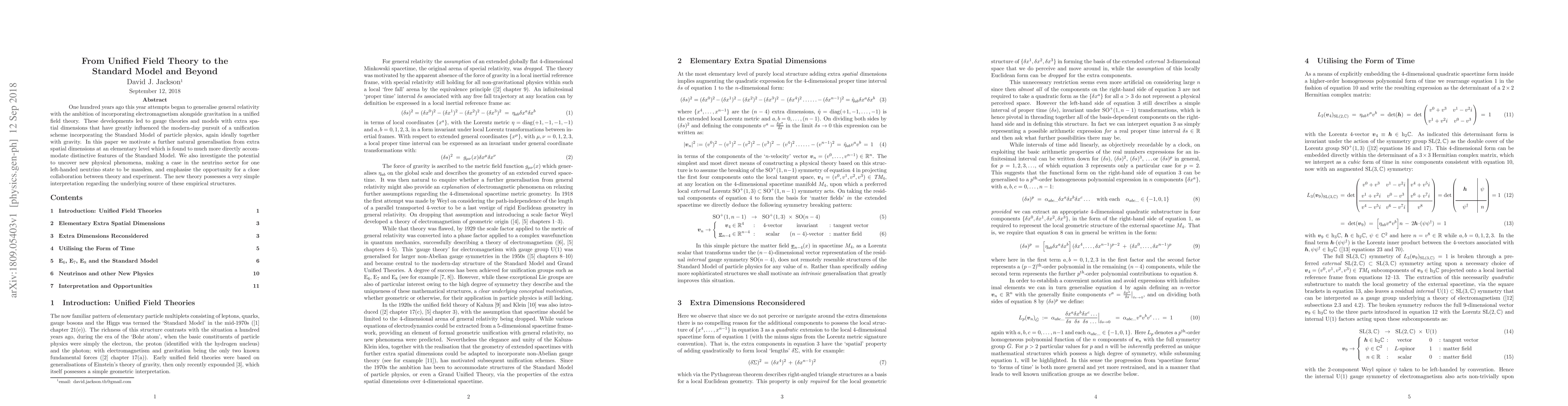 One hundred years ago this year attempts began to generalise general relativity with the ambition of incorporating electromagnetism alongside gravitation in a unified field theory. These developments led to gauge theories and models with extra spatial dimensions that have greatly influenced the modern-day pursuit of a unification scheme incorporating the Standard Model of particle physics, again ideally together with gravity. In this paper we motivate a further natural generalisation from extra spatial dimensions at an elementary level which is found to much more directly accommodate distinctive features of the Standard Model. We also investigate the potential to uncover new physical phenomena, making a case in the neutrino sector for one left-handed neutrino state to be massless, and emphasise the opportunity for a close collaboration between theory and experiment. The new theory possesses a very simple interpretation regarding the underlying source of these empirical structures.