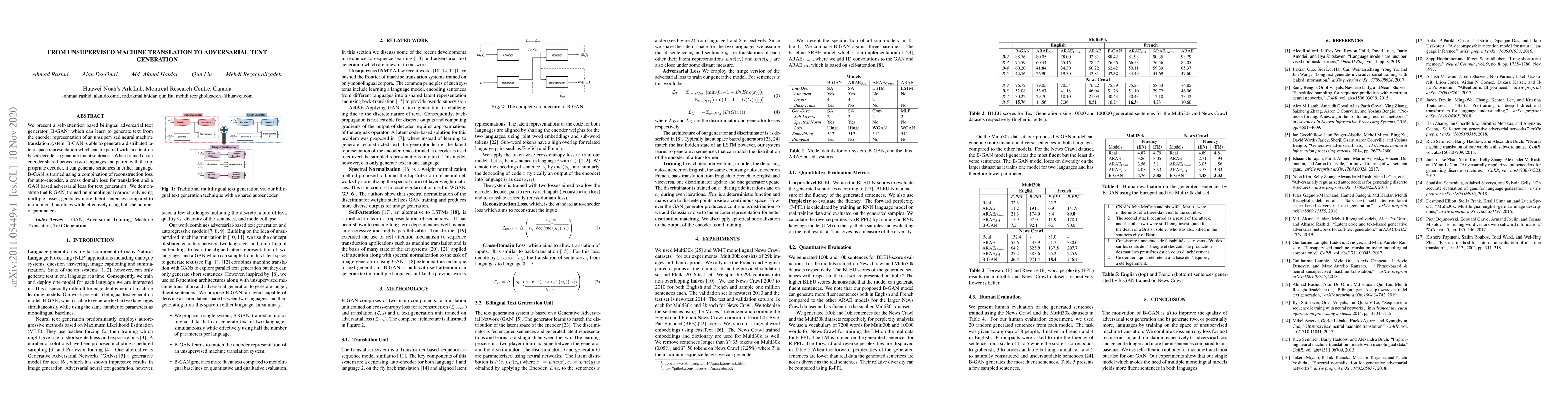 This paper introduces B-GAN, a self-attention based bilingual adversarial text generator that learns to generate text from an unsupervised neural machine translation system's encoder representation. B-GAN combines reconstruction, cross domain, and adversarial losses to produce fluent sentences in either of two languages with fewer parameters compared to monolingual baselines.