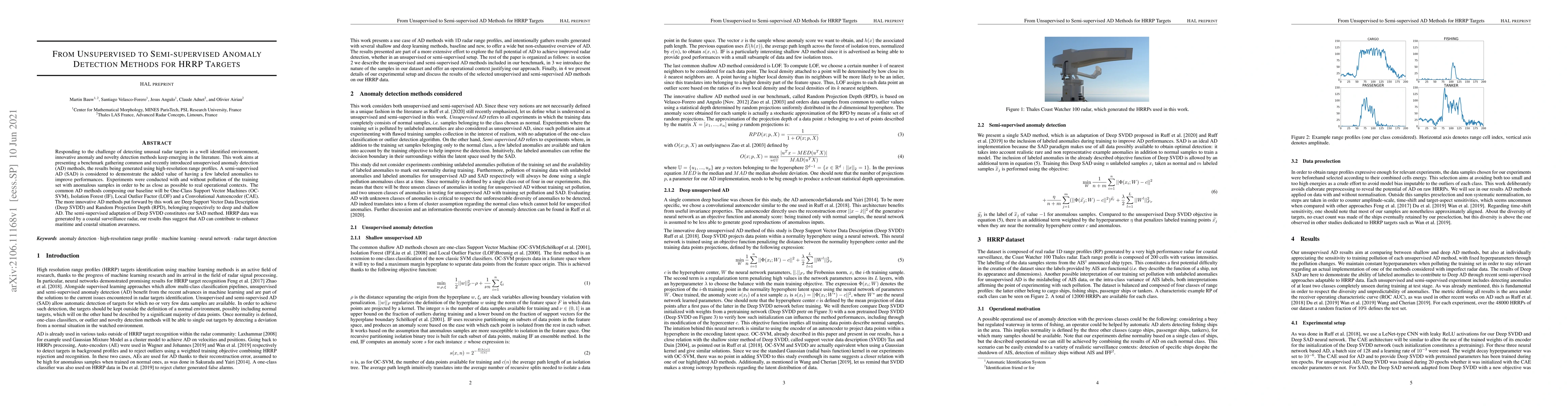 Responding to the challenge of detecting unusual radar targets in a well identified environment, innovative anomaly and novelty detection methods keep emerging in the literature. This work aims at presenting a benchmark gathering common and recently introduced unsupervised anomaly detection (AD) methods, the results being generated using high-resolution range profiles. A semi-supervised AD (SAD) is considered to demonstrate the added value of having a few labeled anomalies to improve performances. Experiments were conducted with and without pollution of the training set with anomalous samples in order to be as close as possible to real operational contexts. The common AD methods composing our baseline will be One-Class Support Vector Machines (OC-SVM), Isolation Forest (IF), Local Outlier Factor (LOF) and a Convolutional Autoencoder (CAE). The more innovative AD methods put forward by this work are Deep Support Vector Data Description (Deep SVDD) and Random Projection Depth (RPD), belonging respectively to deep and shallow AD. The semi-supervised adaptation of Deep SVDD constitutes our SAD method. HRRP data was generated by a coastal surveillance radar, our results thus suggest that AD can contribute to enhance maritime and coastal situation awareness.