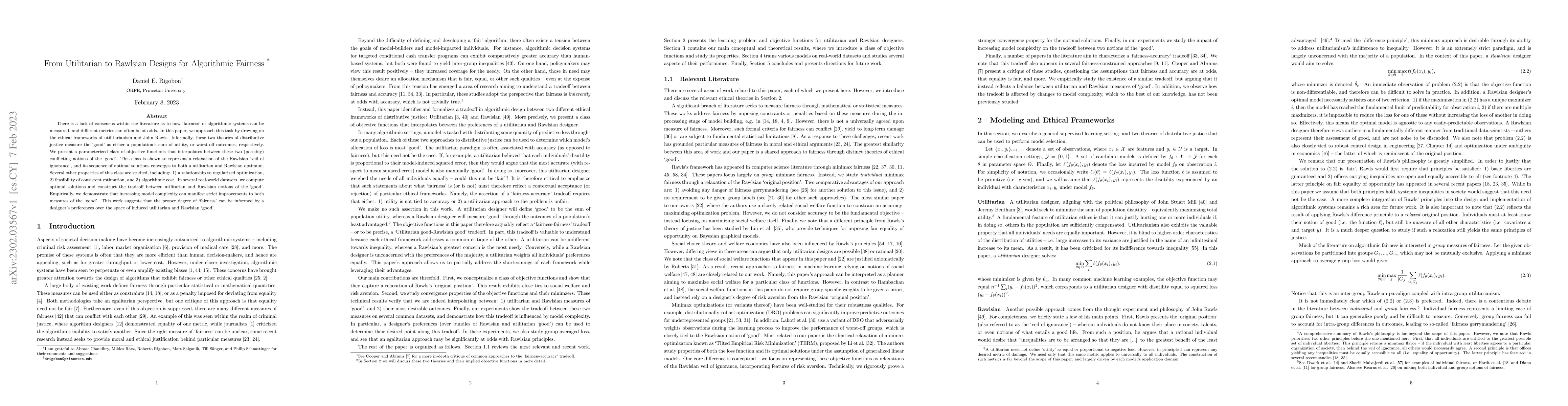 This paper proposes a class of objective functions that interpolates between utilitarian and Rawlsian notions of algorithmic fairness, demonstrating how increasing model complexity can improve both measures. The study also explores the feasibility of consistent estimation and algorithmic cost, suggesting that the degree of fairness can be tailored to a designer's preferences.