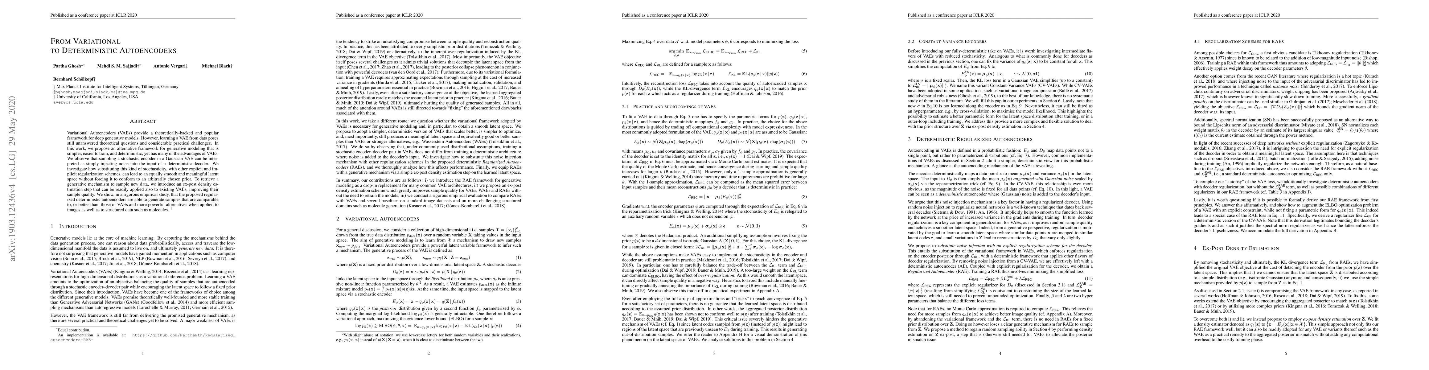 This paper proposes regularized deterministic autoencoders as an alternative to Variational Autoencoders (VAEs), offering a simpler, easier-to-train, and deterministic framework that generates comparable or better samples. The authors introduce explicit and implicit regularization schemes to create a smooth latent space without a predefined prior, and demonstrate superior or equal performance to VAEs on image and structured data.