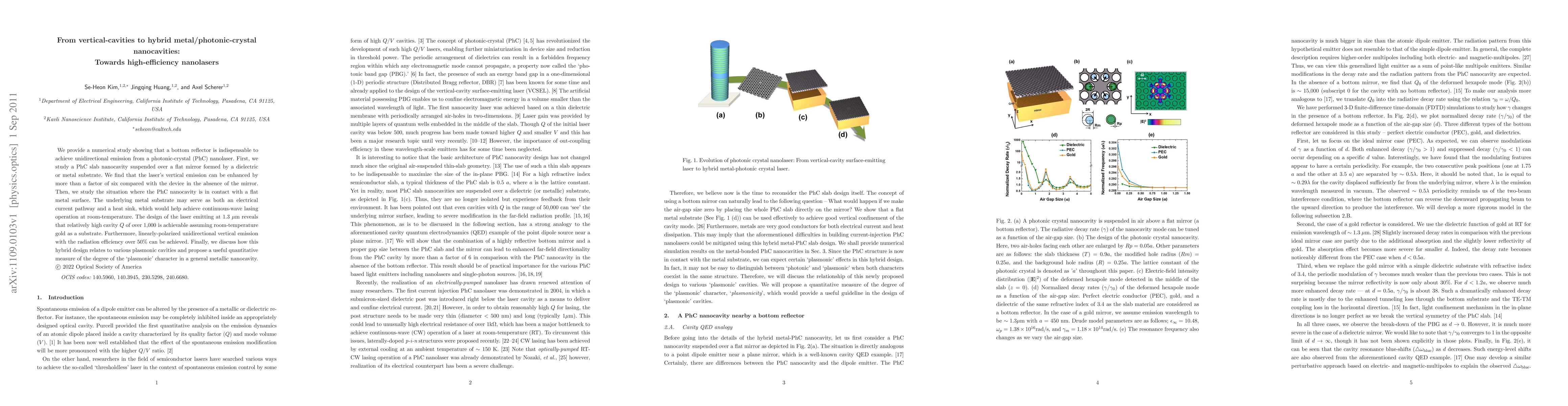 We provide a numerical study showing that a bottom reflector is indispensable to achieve unidirectional emission from a photonic-crystal (PhC) nanolaser. First, we study a PhC slab nanocavity suspended over a flat mirror formed by a dielectric or metal substrate. We find that the laser's vertical emission can be enhanced by more than a factor of six compared with the device in the absence of the mirror. Then, we study the situation where the PhC nanocavity is in contact with a flat metal surface. The underlying metal substrate may serve as both an electrical current pathway and a heat sink, which would help achieve continuous-wave lasing operation at room-temperature. The design of the laser emitting at 1.3 um reveals that relatively high cavity Q of over 1,000 is achievable assuming room-temperature gold as a substrate. Furthermore, linearly-polarized unidirectional vertical emission with the radiation efficiency over 50 % can be achieved. Finally, we discuss how this hybrid design relates to various plasmonic cavities and propose a useful quantitative measure of the degree of the `plasmonic' character in a general metallic nanocavity.