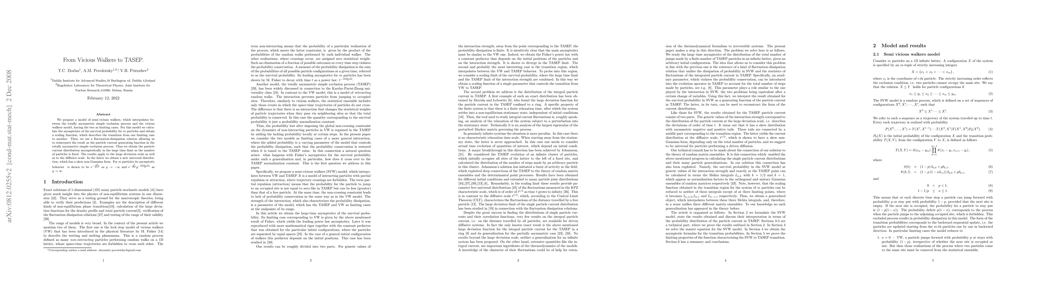 We propose a model of semi-vicious walkers, which interpolates between the totally asymmetric simple exclusion process and the vicious walkers model, having the two as limiting cases. For this model we calculate the asymptotics of the survival probability for $m$ particles and obtain a scaling function, which describes the transition from one limiting case to another. Then, we use a fluctuation-dissipation relation allowing us to reinterpret the result as the particle current generating function in the totally asymmetric simple exclusion process. Thus we obtain the particle current distribution asymptotically in the large time limit as the number of particles is fixed. The results apply to the large deviation scale as well as to the diffusive scale. In the latter we obtain a new universal distribution, which has a skew non-Gaussian form. For $m$ particles its asymptotic behavior is shown to be $e^{-\frac{y^{2}}{2m^{2}}}$ as $y\to -\infty $ and $e^{-\frac{y^{2}}{2m}}y^{-\frac{m(m-1)}{2}}$ as $y\to \infty $.