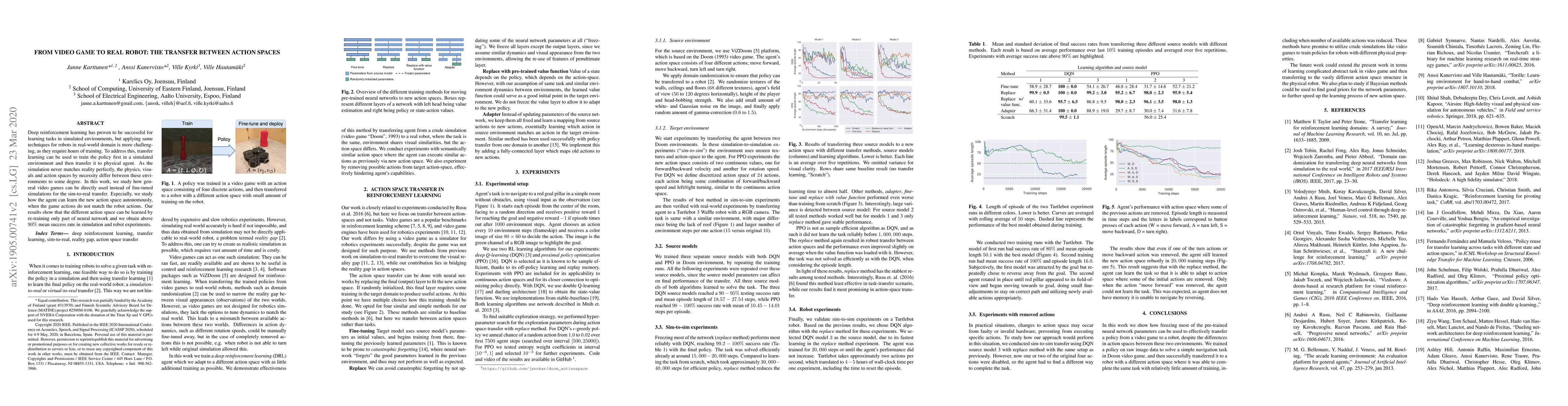 Deep reinforcement learning has proven to be successful for learning tasks in simulated environments, but applying same techniques for robots in real-world domain is more challenging, as they require hours of training. To address this, transfer learning can be used to train the policy first in a simulated environment and then transfer it to physical agent. As the simulation never matches reality perfectly, the physics, visuals and action spaces by necessity differ between these environments to some degree. In this work, we study how general video games can be directly used instead of fine-tuned simulations for the sim-to-real transfer. Especially, we study how the agent can learn the new action space autonomously, when the game actions do not match the robot actions. Our results show that the different action space can be learned by re-training only part of neural network and we obtain above 90% mean success rate in simulation and robot experiments.