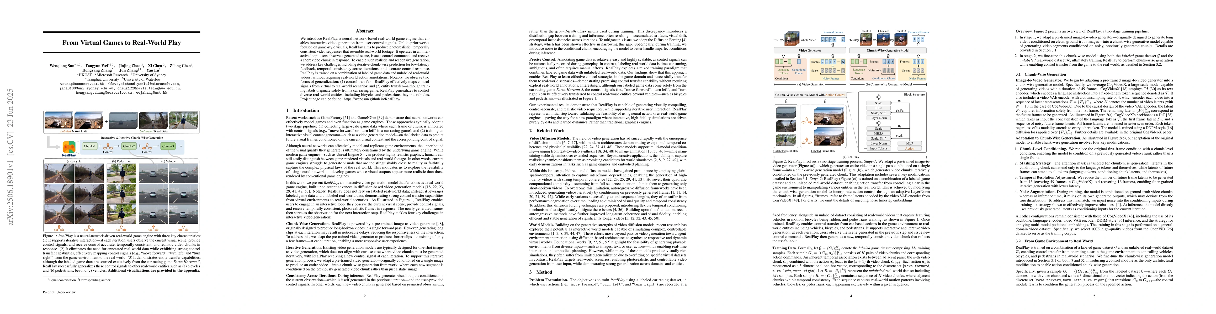We introduce RealPlay, a neural network-based real-world game engine that enables interactive video generation from user control signals. Unlike prior works focused on game-style visuals, RealPlay aims to produce photorealistic, temporally consistent video sequences that resemble real-world footage. It operates in an interactive loop: users observe a generated scene, issue a control command, and receive a short video chunk in response. To enable such realistic and responsive generation, we address key challenges including iterative chunk-wise prediction for low-latency feedback, temporal consistency across iterations, and accurate control response. RealPlay is trained on a combination of labeled game data and unlabeled real-world videos, without requiring real-world action annotations. Notably, we observe two forms of generalization: (1) control transfer-RealPlay effectively maps control signals from virtual to real-world scenarios; and (2) entity transfer-although training labels originate solely from a car racing game, RealPlay generalizes to control diverse real-world entities, including bicycles and pedestrians, beyond vehicles. Project page can be found: https://wenqsun.github.io/RealPlay/