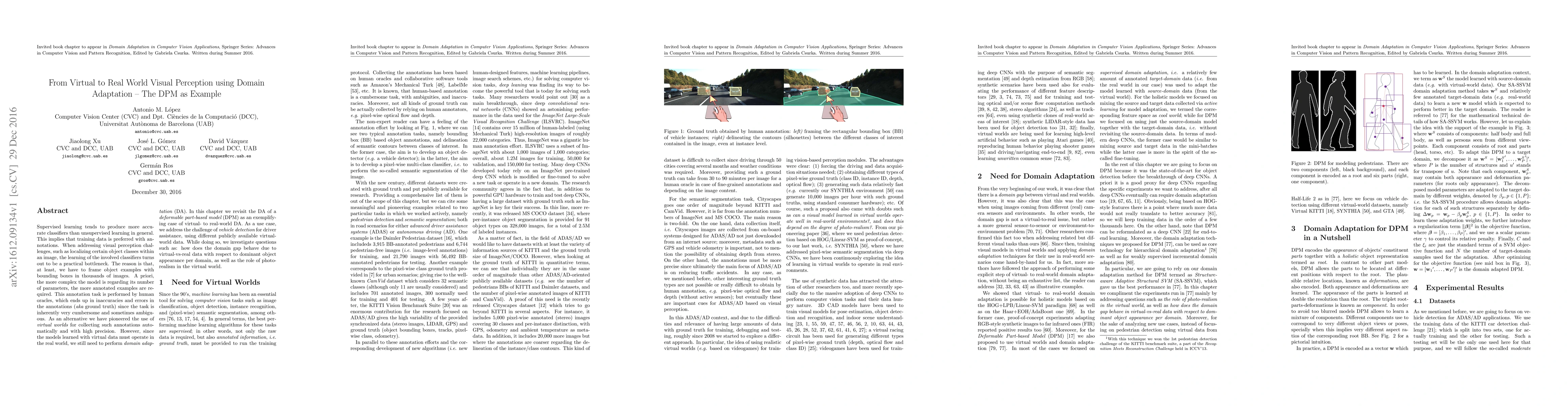 Supervised learning tends to produce more accurate classifiers than unsupervised learning in general. This implies that training data is preferred with annotations. When addressing visual perception challenges, such as localizing certain object classes within an image, the learning of the involved classifiers turns out to be a practical bottleneck. The reason is that, at least, we have to frame object examples with bounding boxes in thousands of images. A priori, the more complex the model is regarding its number of parameters, the more annotated examples are required. This annotation task is performed by human oracles, which ends up in inaccuracies and errors in the annotations (aka ground truth) since the task is inherently very cumbersome and sometimes ambiguous. As an alternative we have pioneered the use of virtual worlds for collecting such annotations automatically and with high precision. However, since the models learned with virtual data must operate in the real world, we still need to perform domain adaptation (DA). In this chapter we revisit the DA of a deformable part-based model (DPM) as an exemplifying case of virtual- to-real-world DA. As a use case, we address the challenge of vehicle detection for driver assistance, using different publicly available virtual-world data. While doing so, we investigate questions such as: how does the domain gap behave due to virtual-vs-real data with respect to dominant object appearance per domain, as well as the role of photo-realism in the virtual world.
