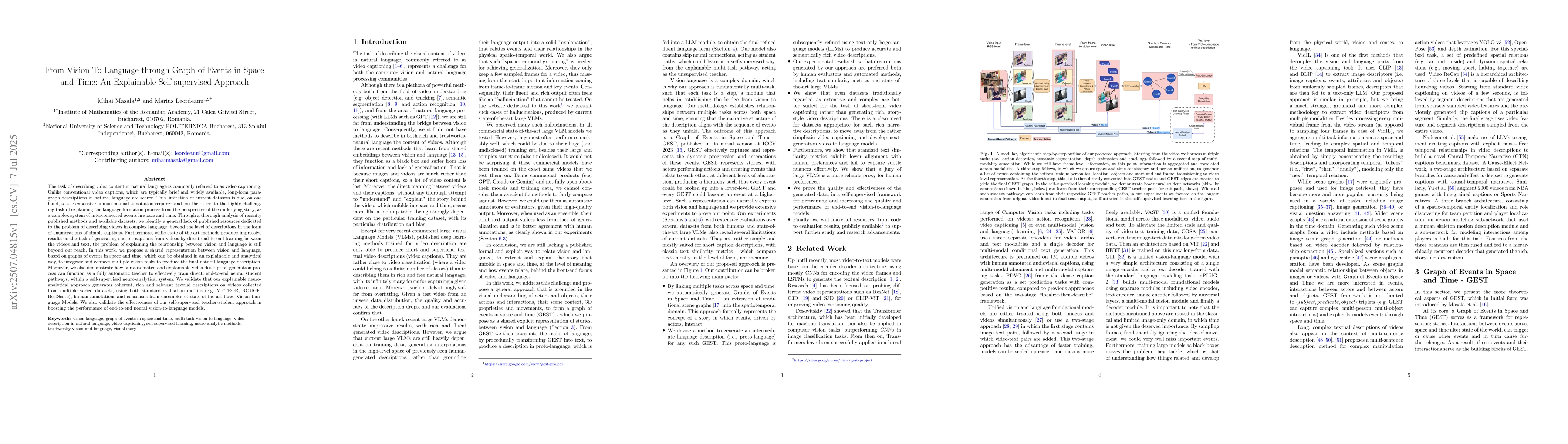 The task of describing video content in natural language is commonly referred to as video captioning. Unlike conventional video captions, which are typically brief and widely available, long-form paragraph descriptions in natural language are scarce. This limitation of current datasets is due to the expensive human manual annotation required and to the highly challenging task of explaining the language formation process from the perspective of the underlying story, as a complex system of interconnected events in space and time. Through a thorough analysis of recently published methods and available datasets, we identify a general lack of published resources dedicated to the problem of describing videos in complex language, beyond the level of descriptions in the form of enumerations of simple captions. Furthermore, while state-of-the-art methods produce impressive results on the task of generating shorter captions from videos by direct end-to-end learning between the videos and text, the problem of explaining the relationship between vision and language is still beyond our reach. In this work, we propose a shared representation between vision and language, based on graphs of events in space and time, which can be obtained in an explainable and analytical way, to integrate and connect multiple vision tasks to produce the final natural language description. Moreover, we also demonstrate how our automated and explainable video description generation process can function as a fully automatic teacher to effectively train direct, end-to-end neural student pathways, within a self-supervised neuro-analytical system. We validate that our explainable neuro-analytical approach generates coherent, rich and relevant textual descriptions on videos collected from multiple varied datasets, using both standard evaluation metrics, human annotations and consensus from ensembles of state-of-the-art VLMs.