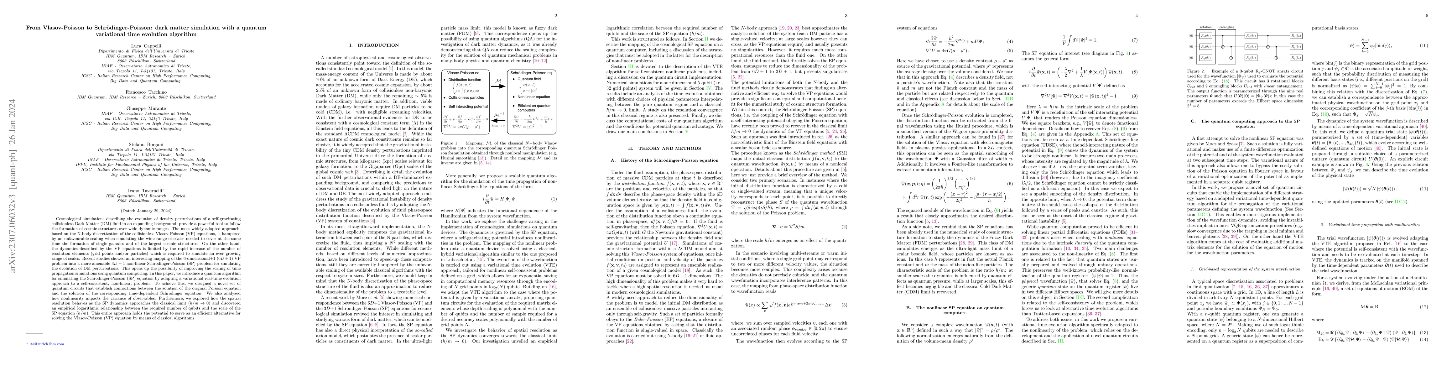 Cosmological simulations describing the evolution of density perturbations of a self-gravitating collisionless Dark Matter (DM) fluid in an expanding background, provide a powerful tool to follow the formation of cosmic structures over wide dynamic ranges. The most widely adopted approach, based on the N-body discretization of the collisionless Vlasov-Poisson (VP) equations, is hampered by an unfavorable scaling when simulating the wide range of scales needed to cover at the same time the formation of single galaxies and of the largest cosmic structures. The dynamics described by the VP equations is limited by the rapid increase of the number of resolution elements which is required to simulate an ever growing range of scales. Recent studies showed an interesting mapping of the 6-dimensional+1 (6D+1) VP problem into a more amenable 3D+1 non-linear Schr\"odinger-Poisson (SP) problem for simulating the evolution of DM perturbations. This opens up the possibility of improving the scaling of time propagation simulations using quantum computing. In this paper, we introduce a quantum algorithm for simulating the (SP) equation by adapting a variational real-time evolution approach to a self-consistent, non-linear, problem. To achieve this, we designed a novel set of quantum circuits that establish connections between the solution of the original Poisson equation and the solution of the corresponding time-dependent Schr\"odinger equation. We also analyzed how nonlinearity impacts the variance of observables. Furthermore, we explored how the spatial resolution behaves as the SP dynamics approaches the classical limit and discovered an empirical logarithmic relationship between the required number of qubits and the scale of the SP equation. This entire approach holds the potential to serve as an efficient alternative for solving the Vlasov-Poisson (VP) equation by means of classical algorithms.