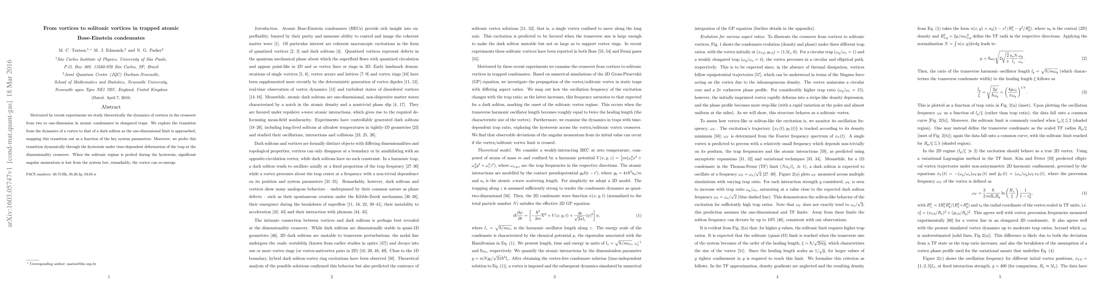 Researchers study the transition from vortex dynamics to solitonic vortices in atomic Bose-Einstein condensates as they approach a one-dimensional limit, finding that the vortex can re-emerge after significant angular momentum loss.