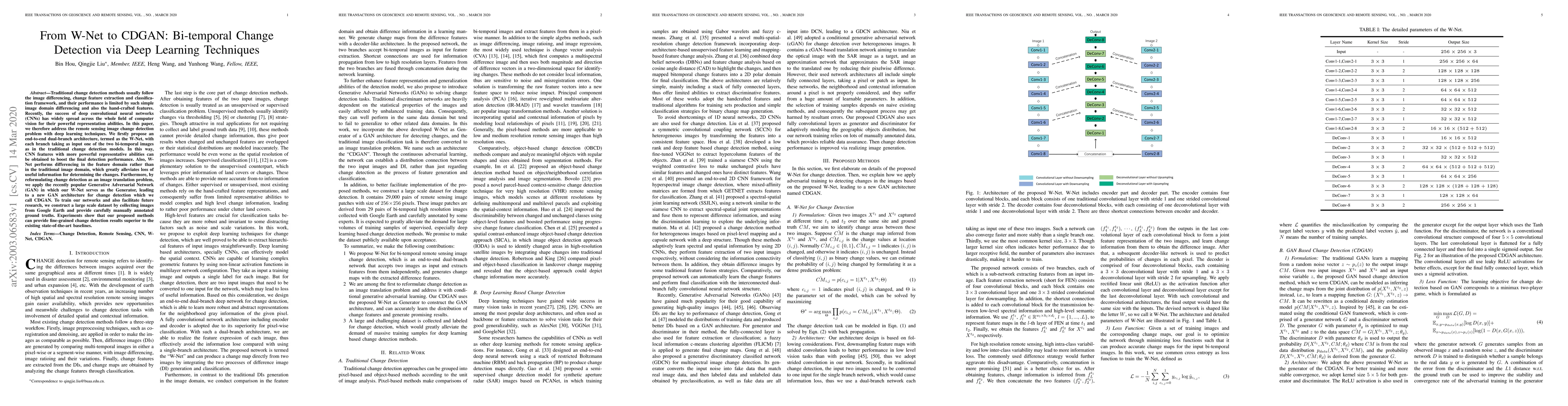 This paper proposes W-Net, a dual-branch CNN architecture for bi-temporal change detection, and CDGAN, a GAN-based approach that reformulates change detection as an image translation problem, achieving superior performance over existing methods. A large-scale dataset with manually annotated ground truths is also introduced to facilitate future research.
