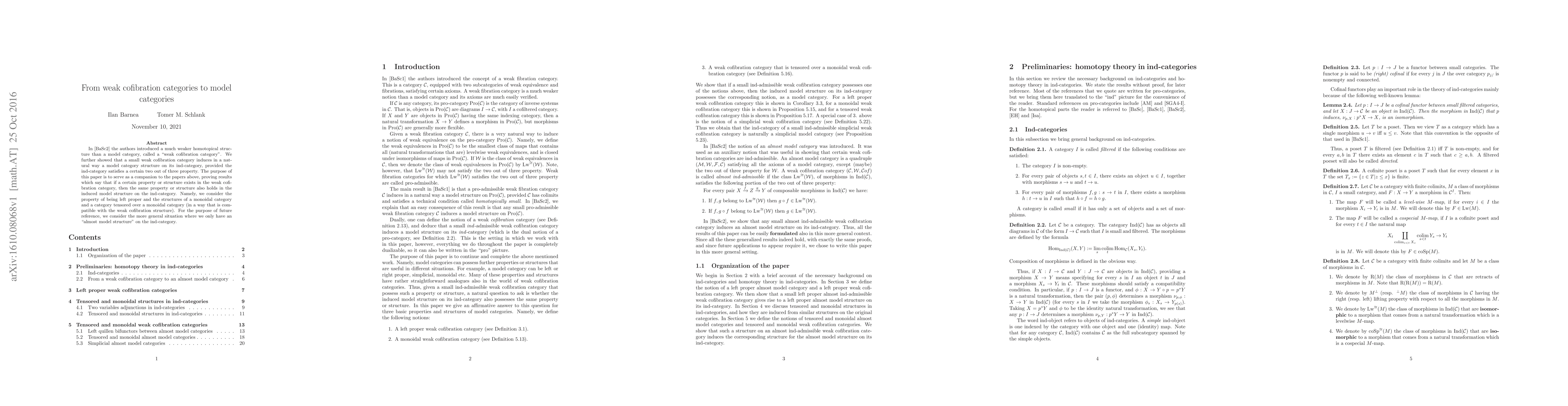 This paper explores how properties such as left properness, monoidal structures, and tensored categories in weak cofibration categories translate to the corresponding induced model category on their ind-category. It also discusses the broader context of "almost model structures" on the ind-category for future reference.