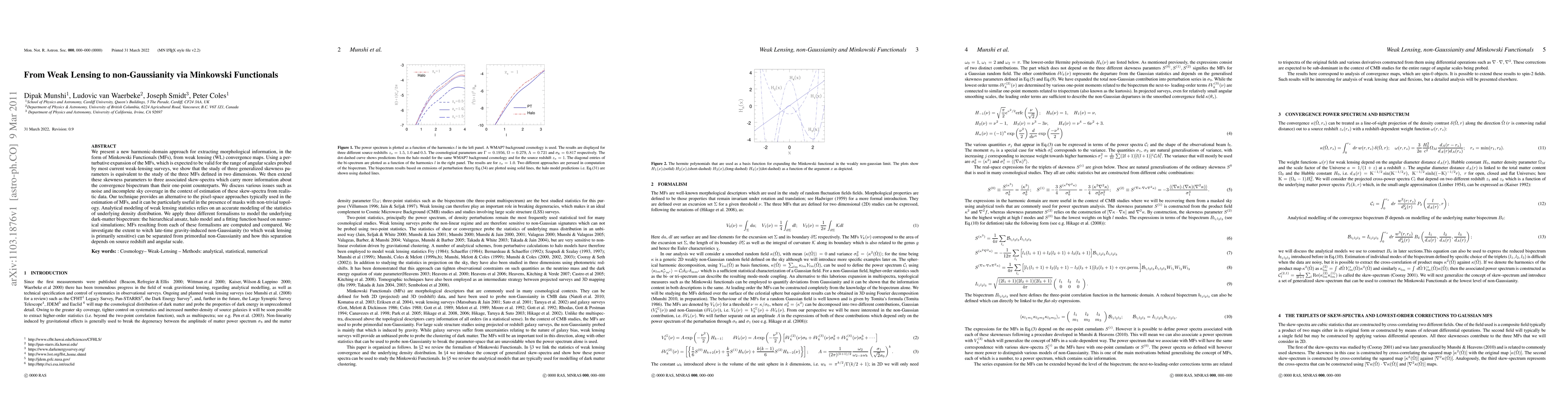 This paper introduces a harmonic-domain approach to extract morphological information from weak lensing convergence maps using Minkowski Functionals. It demonstrates that three generalized skewness parameters are equivalent to three MFs, and extends these to three skew-spectra for enhanced bispectrum analysis, providing an alternative to pixel-space methods. The study also investigates the separation of late-time gravity-induced non-Gaussianity from primordial non-Gaussianity using different dark-matter bispectrum modeling formalisms.