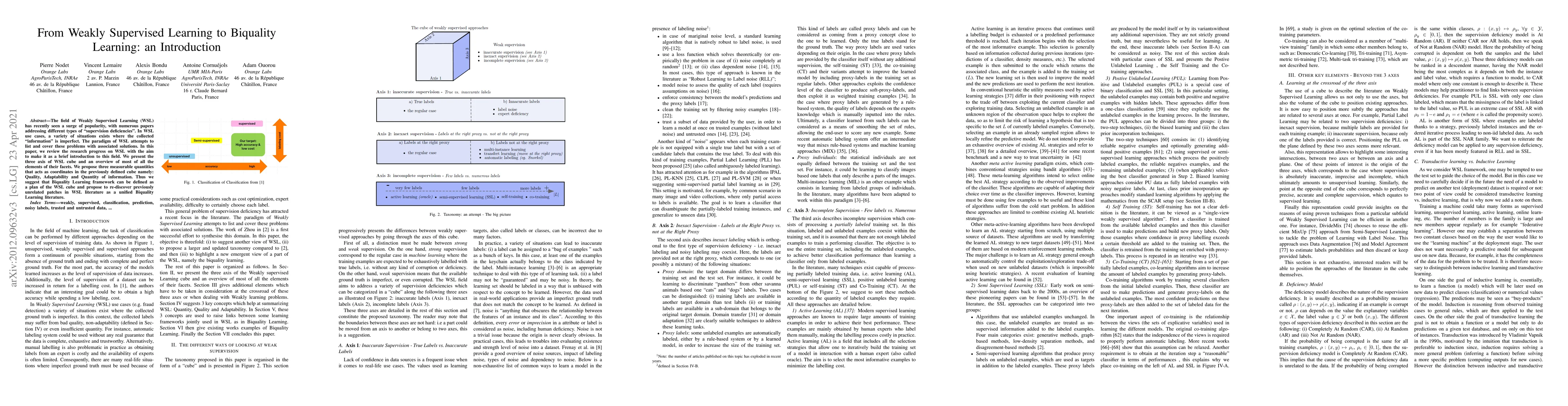 The field of Weakly Supervised Learning (WSL) has recently seen a surge of popularity, with numerous papers addressing different types of "supervision deficiencies". In WSL use cases, a variety of situations exists where the collected "information" is imperfect. The paradigm of WSL attempts to list and cover these problems with associated solutions. In this paper, we review the research progress on WSL with the aim to make it as a brief introduction to this field. We present the three axis of WSL cube and an overview of most of all the elements of their facets. We propose three measurable quantities that acts as coordinates in the previously defined cube namely: Quality, Adaptability and Quantity of information. Thus we suggest that Biquality Learning framework can be defined as a plan of the WSL cube and propose to re-discover previously unrelated patches in WSL literature as a unified Biquality Learning literature.