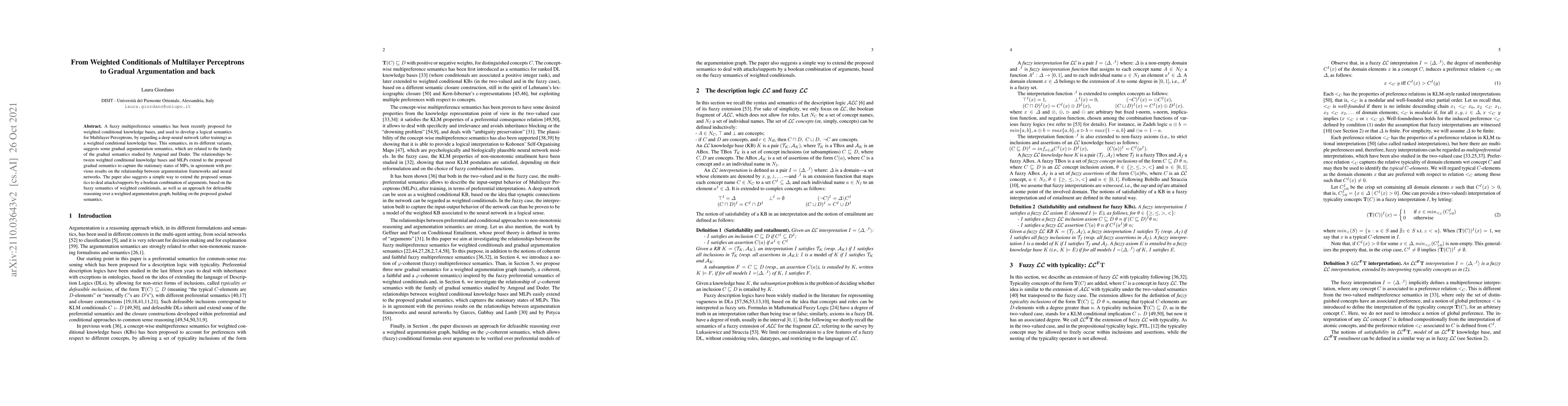 This paper proposes a fuzzy multipreference semantics for weighted conditional knowledge bases, linking it to Multilayer Perceptrons (MLPs) and gradual argumentation semantics. It also introduces a method for defeasible reasoning over weighted argumentation graphs and addresses attacks/supports via boolean combinations based on fuzzy semantics.