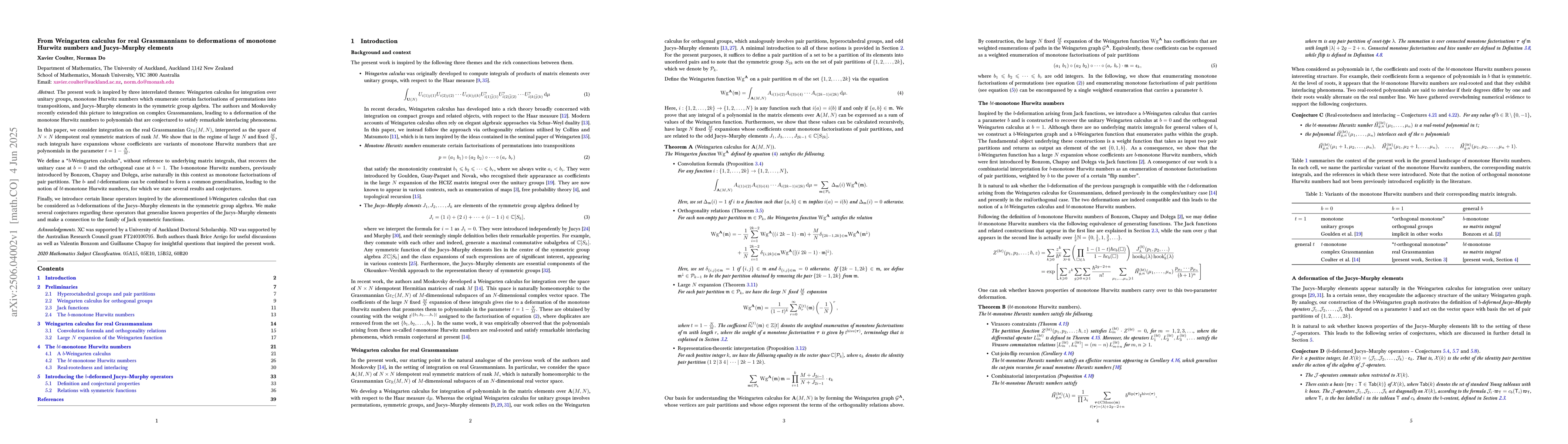Researchers explore a connection between Weingarten calculus, Hurwitz numbers, and Jucys-Murphy elements on the real Grassmannian, finding polynomials that satisfy interlacing phenomena in large N.