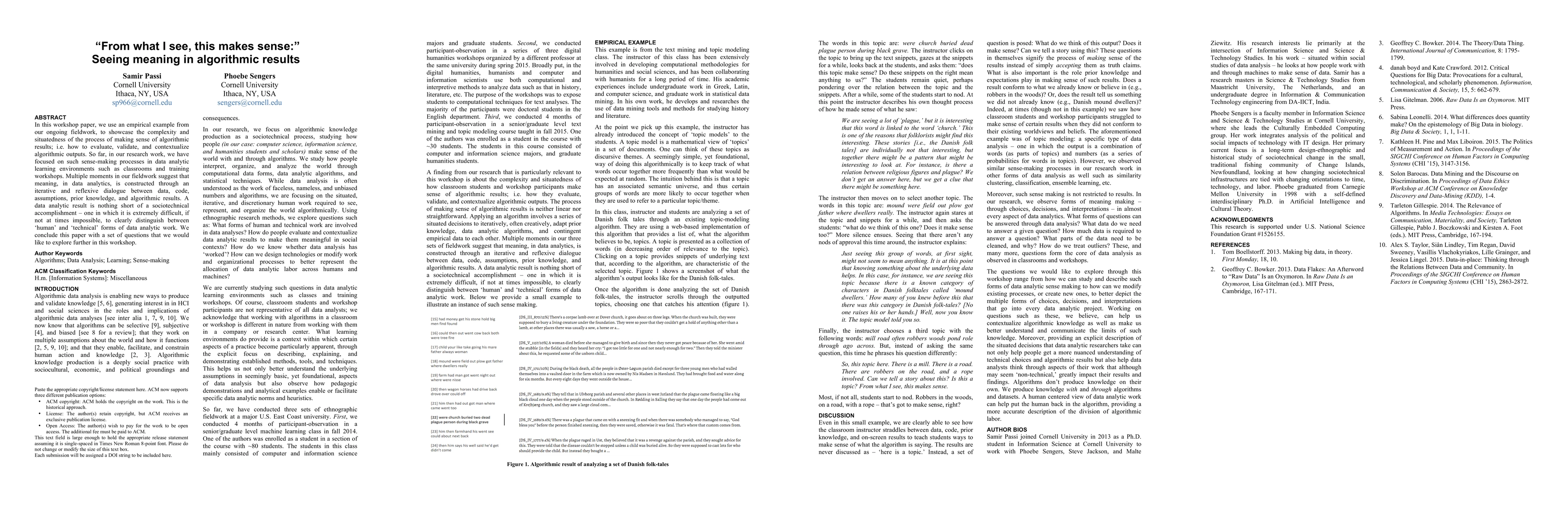 In this workshop paper, we use an empirical example from our ongoing fieldwork, to showcase the complexity and situatedness of the process of making sense of algorithmic results; i.e. how to evaluate, validate, and contextualize algorithmic outputs. So far, in our research work, we have focused on such sense-making processes in data analytic learning environments such as classrooms and training workshops. Multiple moments in our fieldwork suggest that meaning, in data analytics, is constructed through an iterative and reflexive dialogue between data, code, assumptions, prior knowledge, and algorithmic results. A data analytic result is nothing short of a sociotechnical accomplishment - one in which it is extremely difficult, if not at times impossible, to clearly distinguish between 'human' and 'technical' forms of data analytic work. We conclude this paper with a set of questions that we would like to explore further in this workshop.