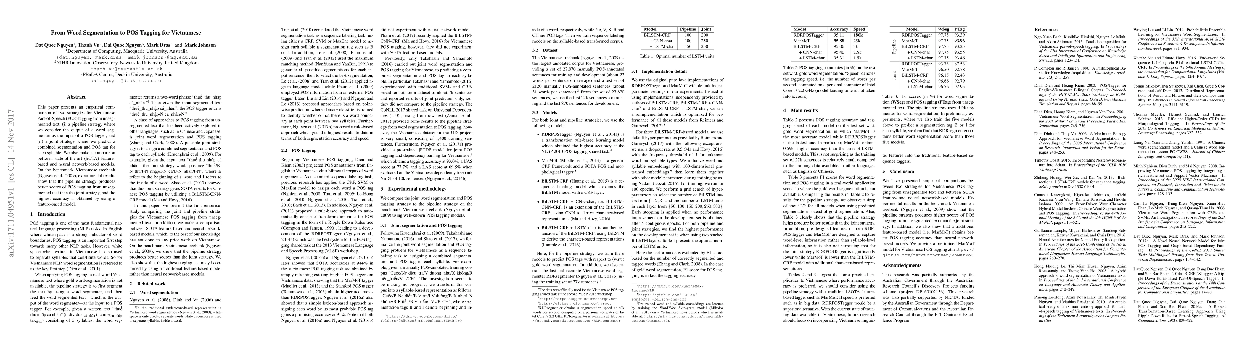 This paper compares two Vietnamese POS tagging strategies—a pipeline and a joint approach—and finds that the pipeline strategy yields better results than the joint one, with feature-based models achieving the highest accuracy on a Vietnamese treebank.