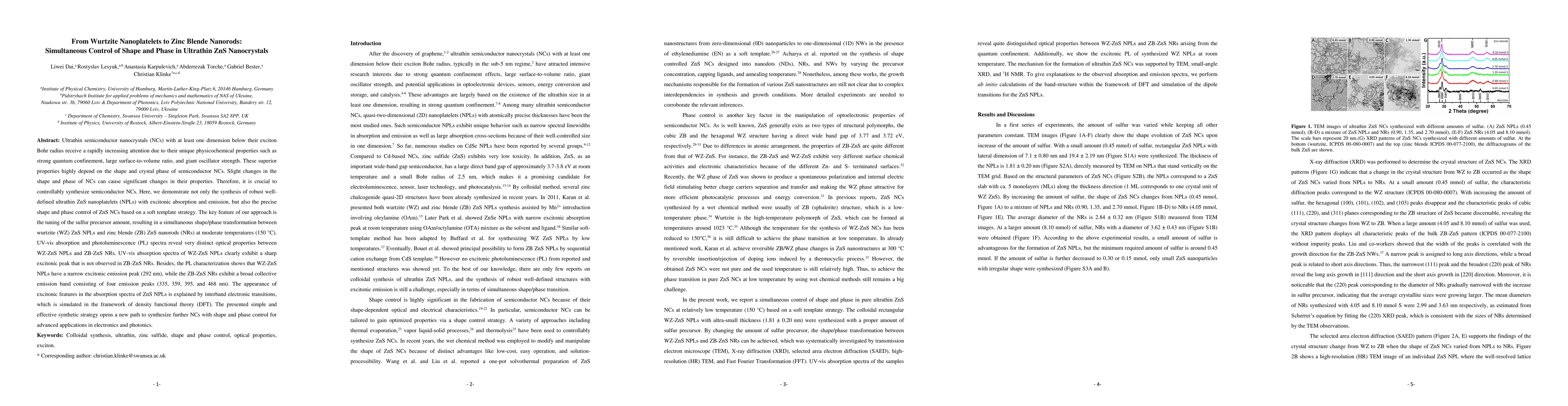 This paper presents a method for synthesizing ultrathin ZnS nanocrystals with controlled shape and phase, demonstrating the transformation from wurtzite ZnS nanoplatelets to zinc blende ZnS nanorods via a soft template strategy. The distinct optical properties of the two phases, revealed through UV-vis absorption and photoluminescence spectra, highlight the potential for advanced applications in electronics and photonics.