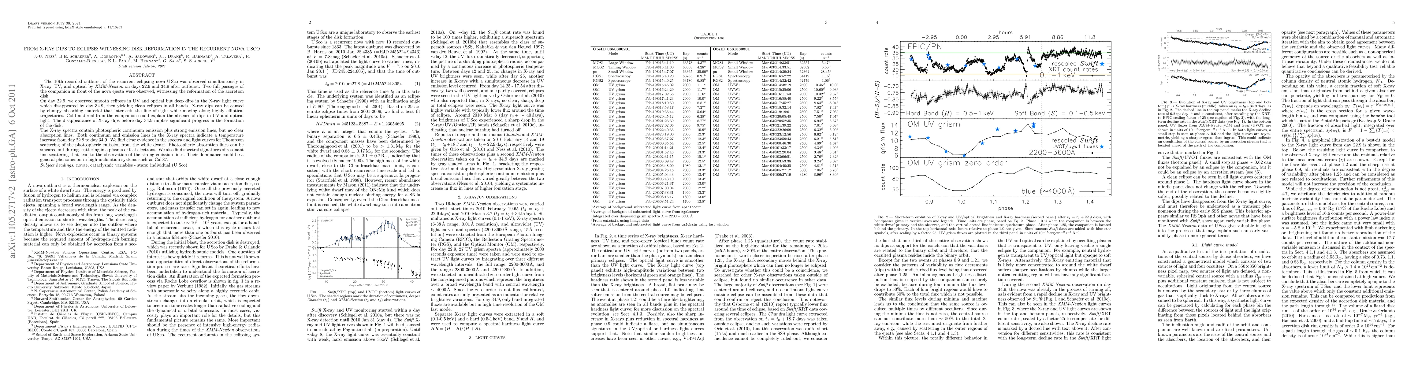 The 10th recorded outburst of the recurrent eclipsing nova USco was observed simultaneously in X-ray, UV, and optical by XMM-Newton on days 22.9 and 34.9 after outburst. Two full passages of the companion in front of the nova ejecta were observed, witnessing the reformation of the accretion disk. On day 22.9, we observed smooth eclipses in UV and optical but deep dips in the X-ray light curve which disappeared by day 34.9, then yielding clean eclipses in all bands. X-ray dips can be caused by clumpy absorbing material that intersects the line of sight while moving along highly elliptical trajectories. Cold material from the companion could explain the absence of dips in UV and optical light. The disappearance of X-ray dips before day 34.9 implies significant progress in the formation of the disk. The X-ray spectra contain photospheric continuum emission plus strong emission lines, but no clear absorption lines. Both continuum and emission lines in the X-ray spectra indicate a temperature increase from day 22.9 to day 34.9. We find clear evidence in the spectra and light curves for Thompson scattering of the photospheric emission from the white dwarf. Photospheric absorption lines can be smeared out during scattering in a plasma of fast electrons. We also find spectral signatures of resonant line scattering that lead to the observation of the strong emission lines. Their dominance could be a general phenomenon in high-inclination systems such as Cal87.