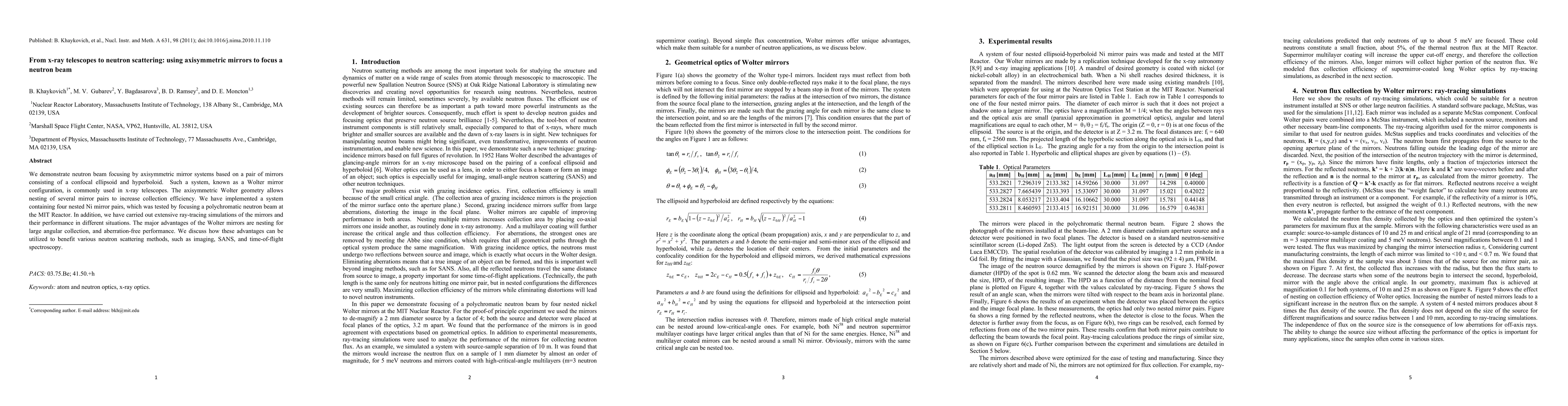 This paper demonstrates neutron beam focusing using a Wolter mirror configuration, originally designed for x-ray telescopes, with four nested Ni mirror pairs tested at the MIT Reactor. The study highlights the advantages of this geometry for large angular collection and aberration-free performance, suggesting its potential benefits for neutron imaging, SANS, and time-of-flight spectroscopy.