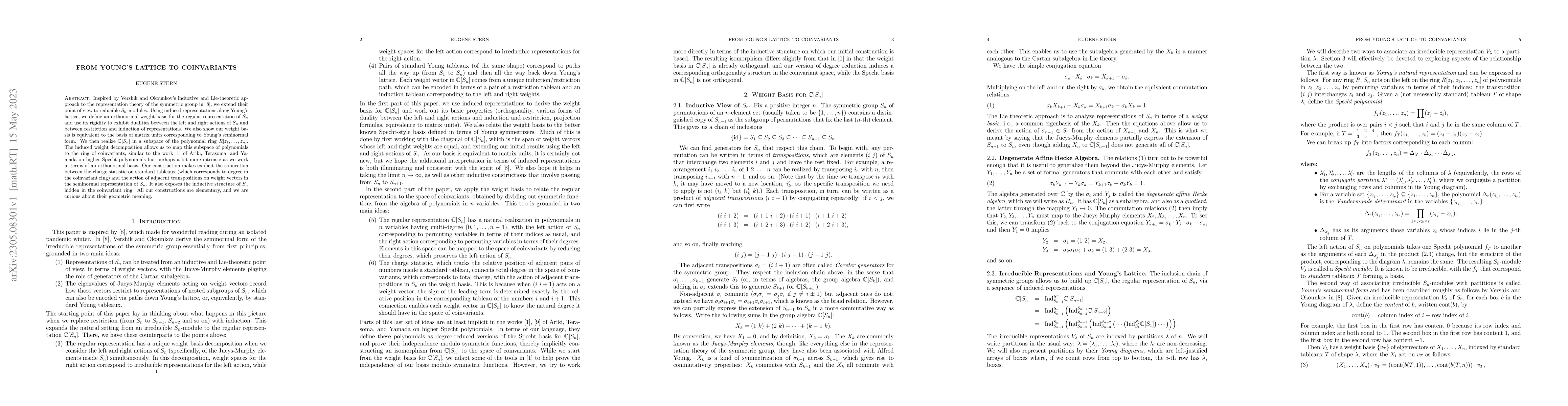 Inspired by Vershik and Okounkov's inductive and Lie-theoretic approach to the representation theory of the symmetric group, we extend their point of view to reducible $S_n$-modules. Using induced representations along Young's lattice, we define an orthonormal weight basis for the regular representation of $S_n$ and use its rigidity to exhibit dualities between the left and right actions of $S_n$ and between restriction and induction of representations. We also show our weight basis is equivalent to the basis of matrix units corresponding to Young's seminormal form. We then realize $\mathbb{C}[S_n]$ in a subspace of the polynomial ring $R[z_1, \ldots , z_n]$. The induced weight decomposition allows us to map this subspace of polynomials to the ring of coinvariants, similar to the work of Ariki, Terasoma, and Yamada on higher Specht polynomials but perhaps a bit more intrinsic as we work in terms of an orthonormal basis. Our construction makes explicit the connection between the charge statistic on standard tableaux (which corresponds to degree in the coinvariant ring) and the action of adjacent transpositions on weight vectors in the seminormal representation of $S_n$. It also exposes the inductive structure of $S_n$ hidden in the coinvariant ring. All our constructions are elementary, and we are curious about their geometric meaning.