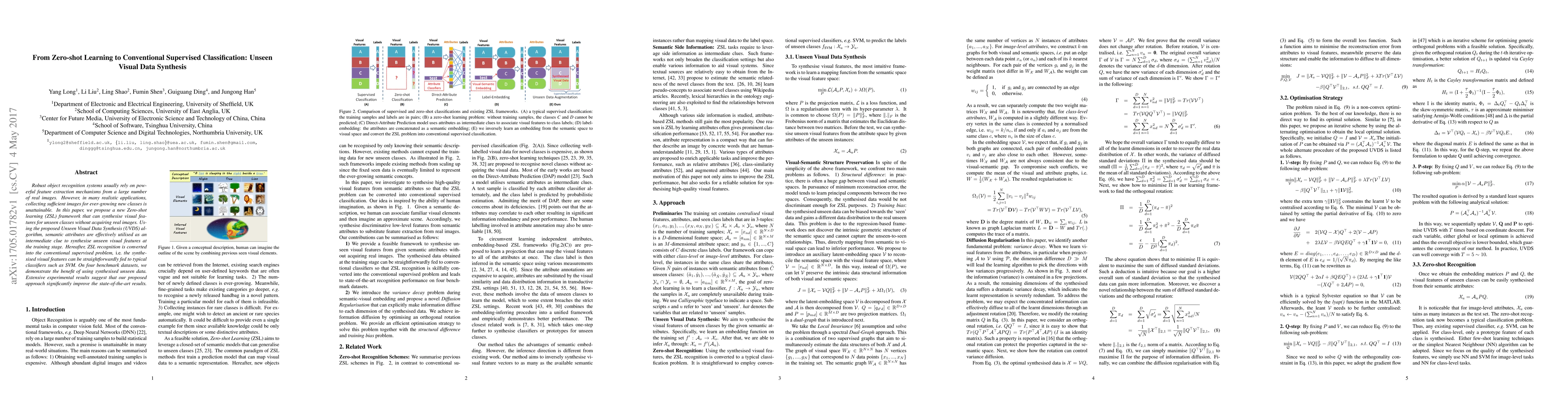 This paper proposes a Zero-shot learning framework that synthesizes visual features for unseen classes using semantic attributes without real images. The Unseen Visual Data Synthesis (UVDS) algorithm converts ZSL into a supervised classification problem, achieving state-of-the-art results on benchmark datasets.
