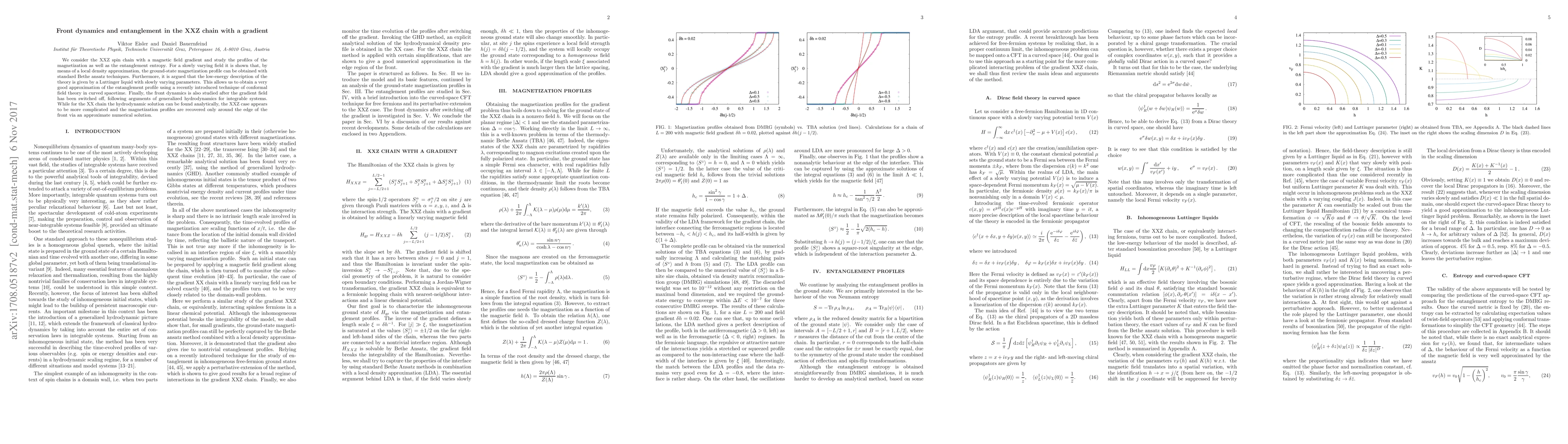 This paper investigates the magnetization and entanglement entropy in the XXZ spin chain with a magnetic field gradient, employing Bethe ansatz and conformal field theory techniques. It finds that the system behaves like a Luttinger liquid with varying parameters, and uses generalized hydrodynamics to study front dynamics post-gradient removal.