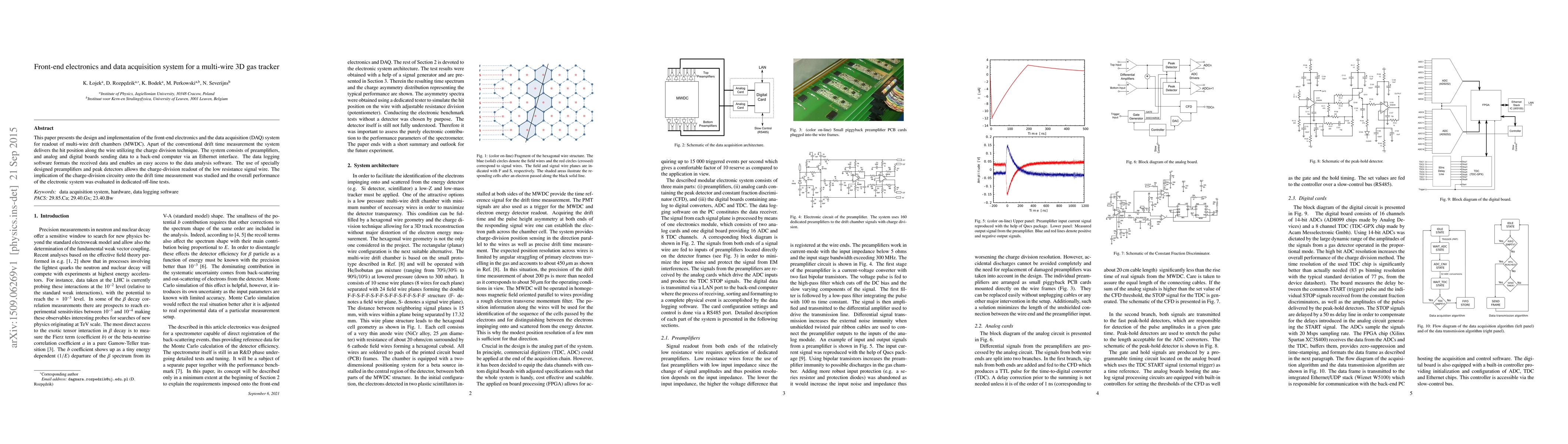 This paper details the design and implementation of front-end electronics and a data acquisition system for multi-wire drift chambers, incorporating charge division for hit position along wires, and evaluates the system's performance through dedicated off-line tests. The system uses preamplifiers and peak detectors for low resistance signal wire readout, and data is sent to a back-end computer for analysis.