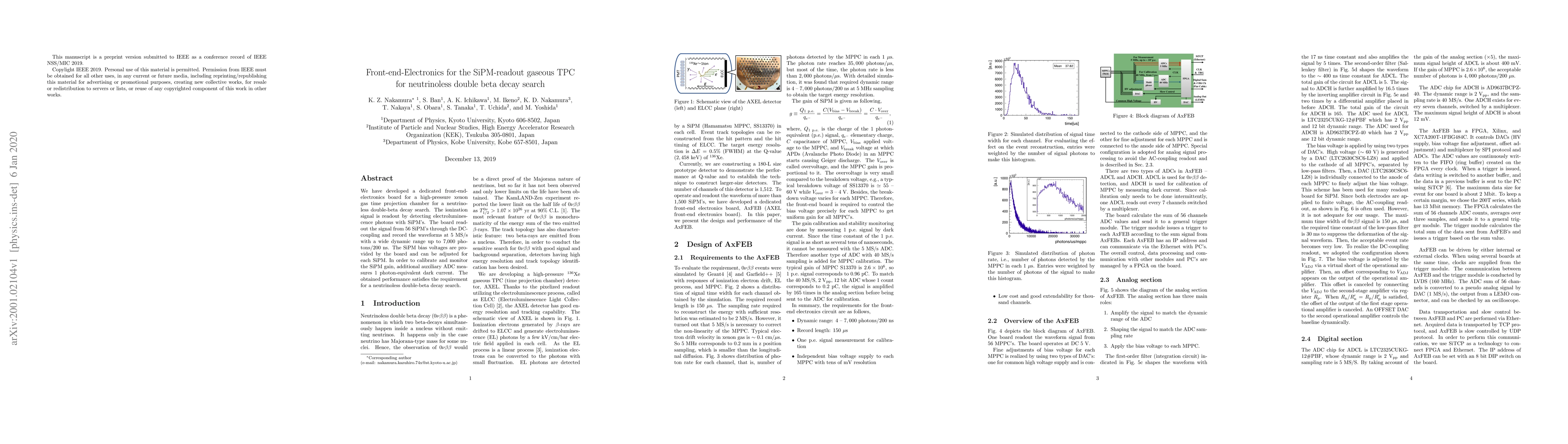 We have developed a dedicated front-end-electronics board for a high-pressure xenon gas time projection chamber for a neutrinoless double-beta decay search. The ionization signal is readout by detecting electroluminescence photons with SiPM's. The board readout the signal from 56~SiPM's through the DC-coupling and record the waveforms at 5 MS/s with a wide dynamic range up to 7,000 photons/200 ns. The SiPM bias voltages are provided by the board and can be adjusted for each SiPM. In order to calibrate and monitor the SiPM gain, additional auxiliary ADC measures 1 photon-equivalent dark current. The obtained performance satisfies the requirement for a neutrinoless double-beta decay search.