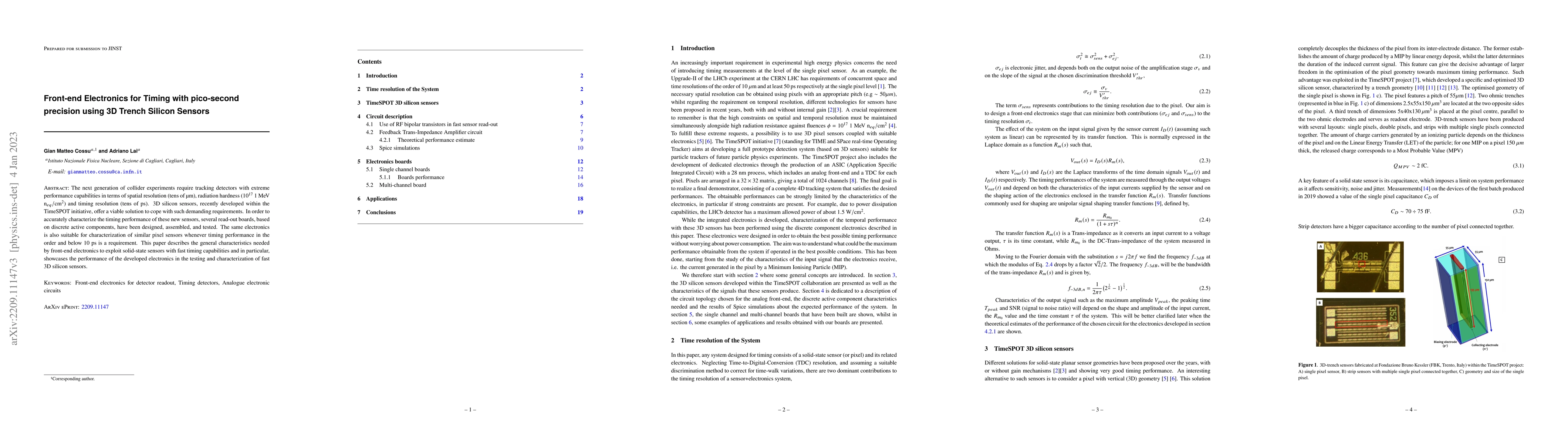 This paper discusses the design and testing of front-end electronics for achieving pico-second timing precision using 3D trench silicon sensors, crucial for next-generation collider experiments. The developed electronics, based on discrete active components, demonstrate high-performance timing capabilities suitable for various fast pixel sensors.