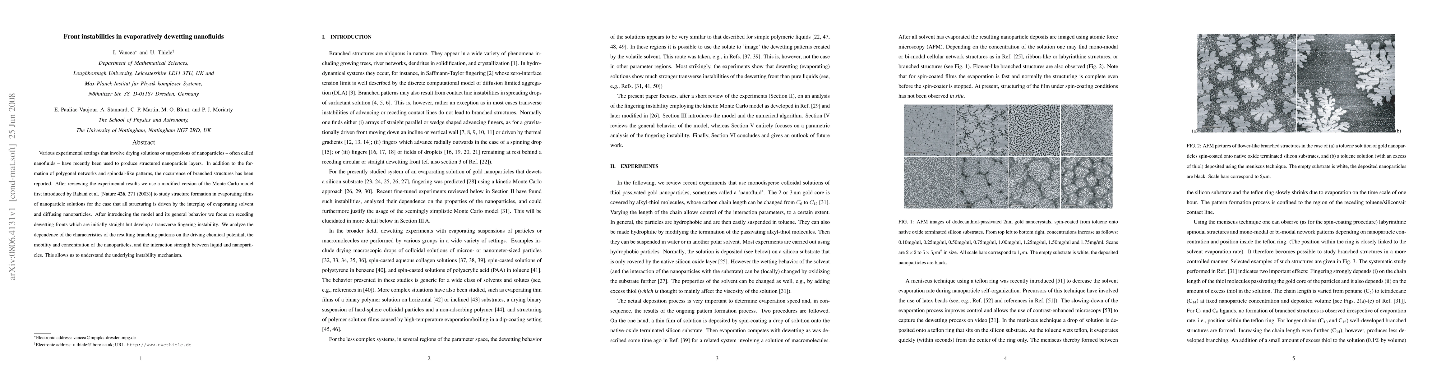 Various experimental settings that involve drying solutions or suspensions of nanoparticles -- often called nanofluids -- have recently been used to produce structured nanoparticle layers. In addition to the formation of polygonal networks and spinodal-like patterns, the occurrence of branched structures has been reported. After reviewing the experimental results we use a modified version of the Monte Carlo model first introduced by Rabani et al. [Nature 426, 271 (2003)] to study structure formation in evaporating films of nanoparticle solutions for the case that all structuring is driven by the interplay of evaporating solvent and diffusing nanoparticles. After introducing the model and its general behavior we focus on receding dewetting fronts which are initially straight but develop a transverse fingering instability. We analyze the dependence of the characteristics of the resulting branching patterns on the driving chemical potential, the mobility and concentration of the nanoparticles, and the interaction strength between liquid and nanoparticles. This allows us to understand the underlying instability mechanism.
