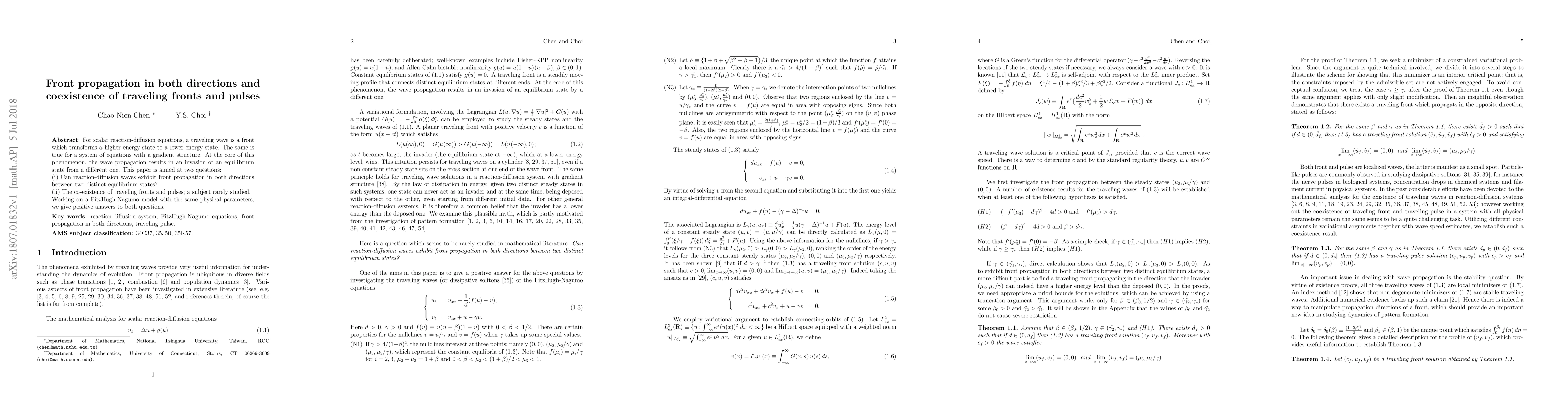 For scalar reaction-diffusion equations, a traveling wave is a front which transforms a higher energy state to a lower energy state. The same is true for a system of equations with a gradient structure. At the core of this phenomenon, the wave propagation results in an invasion of an equilibrium state from a different one. This paper is aimed at two questions: (i) Can reaction-diffusion waves exhibit front propagation in both directions between two distinct equilibrium states? (ii) The co-existence of traveling fronts and pulses; a subject rarely studied. Working on a FitzHugh-Nagumo model with the same physical parameters, we give positive answers to both questions.