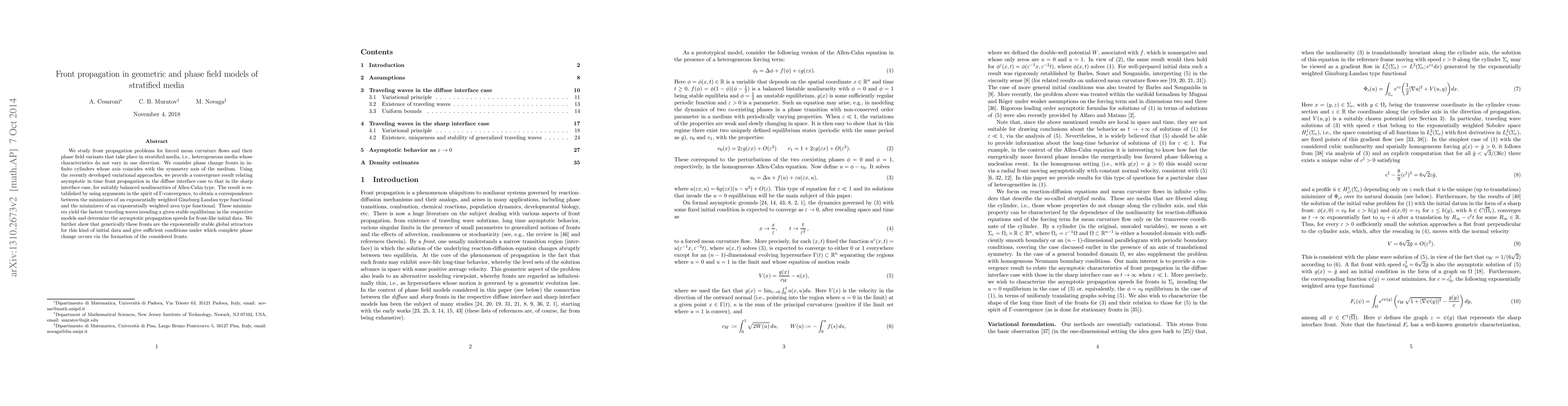 We study front propagation problems for forced mean curvature flows and their phase field variants that take place in stratified media, i.e., heterogeneous media whose characteristics do not vary in one direction. We consider phase change fronts in infinite cylinders whose axis coincides with the symmetry axis of the medium. Using the recently developed variational approaches, we provide a convergence result relating asymptotic in time front propagation in the diffuse interface case to that in the sharp interface case, for suitably balanced nonlinearities of Allen-Cahn type. The result is established by using arguments in the spirit of $\Gamma$-convergence, to obtain a correspondence between the minimizers of an exponentially weighted Ginzburg-Landau type functional and the minimizers of an exponentially weighted area type functional. These minimizers yield the fastest traveling waves invading a given stable equilibrium in the respective models and determine the asymptotic propagation speeds for front-like initial data. We further show that generically these fronts are the exponentially stable global attractors for this kind of initial data and give sufficient conditions under which complete phase change occurs via the formation of the considered fronts.