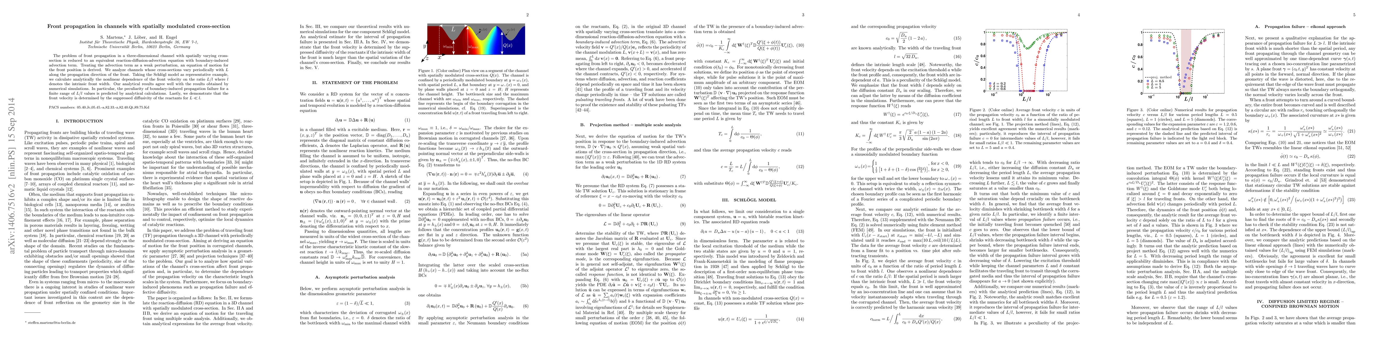 This paper studies the propagation of traveling fronts in three-dimensional reaction-diffusion systems with spatially modulated cross-sections using the Schlögl model. Analytical techniques reveal the effect of medium corrugation on front velocity, predicting nonlinear dependencies and identifying conditions for propagation failure.