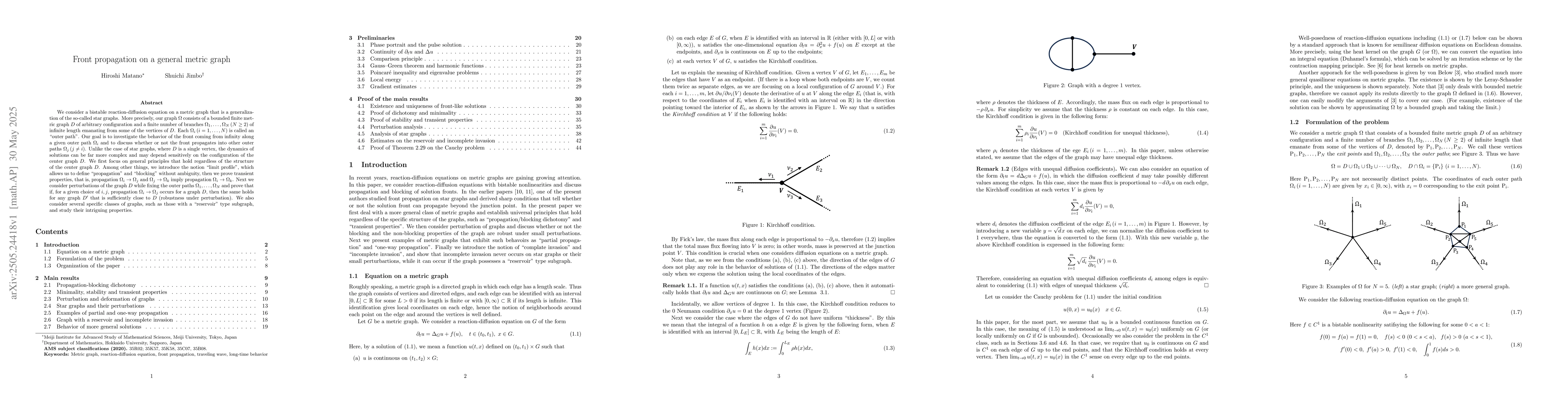 We consider a bistable reaction-diffusion equation on a metric graph that is a generalization of the so-called star graphs. More precisely, our graph $\Omega$ consists of a bounded finite metric graph $D$ of arbitrary configuration and a finite number of branches $\Omega_1,\ldots,\Omega_N\,(N\geq 2)$ of infinite length emanating from some of the vertices of $D$. Each $\Omega_i\,(i=1,\ldots,N)$ is called an ``outer path''. Our goal is to investigate the behavior of the front coming from infinity along a given outer path $\Omega_i$ and to discuss whether or not the front propagates into other outer paths $\Omega_j\,(j\ne i)$. Unlike the case of star graphs, where $D$ is a single vertex, the dynamics of solutions can be far more complex and may depend sensitively on the configuration of the center graph $D$. We first focus on general principles that hold regardless of the structure of the center graph $D$. Among other things, we introduce the notion ``limit profile'', which allows us to define ``propagation'' and ``blocking'' without ambiguity, then we prove transient properties, that is, propagation $\Omega_i\to \Omega_j$ and $\Omega_j\to \Omega_k$ imply propagation $\Omega_i\to \Omega_k$. Next we consider perturbations of the graph $D$ while fixing the outer paths $\Omega_1,\ldots,\Omega_N$ and prove that if, for a given choice of $i,j$, propagation $\Omega_i\to \Omega_j$ occurs for a graph $D$, then the same holds for any graph $D'$ that is sufficiently close to $D$ (robustness under perturbation). We also consider several specific classes of graphs, such as those with a ``reservoir'' type subgraph, and study their intriguing properties.