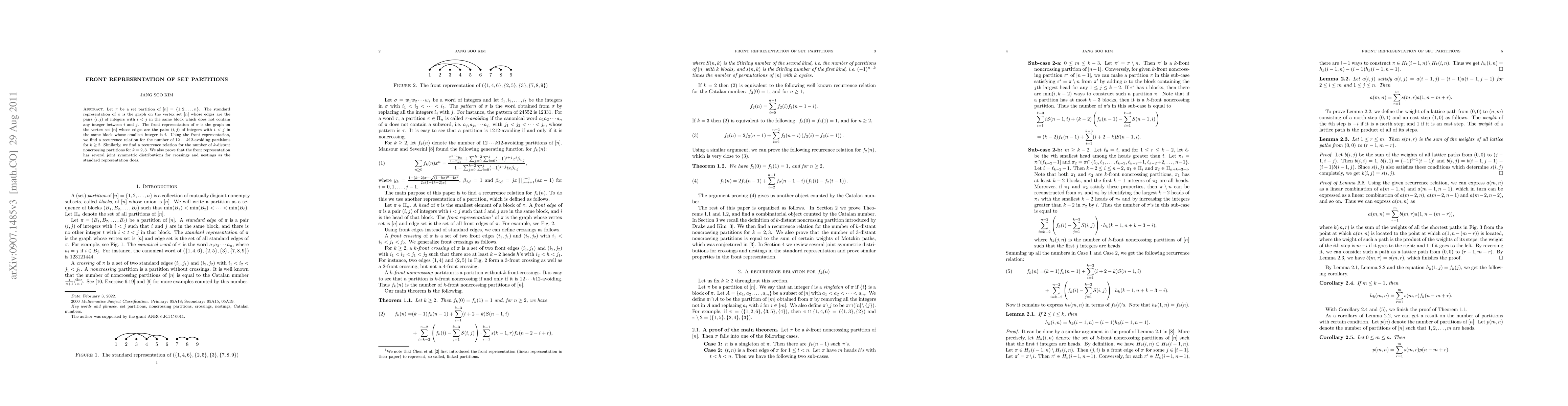 This paper introduces a new graph representation called the front representation of set partitions, which leads to new recurrence relations for certain types of partitions, including k12-avoiding and k-distant noncrossing partitions.