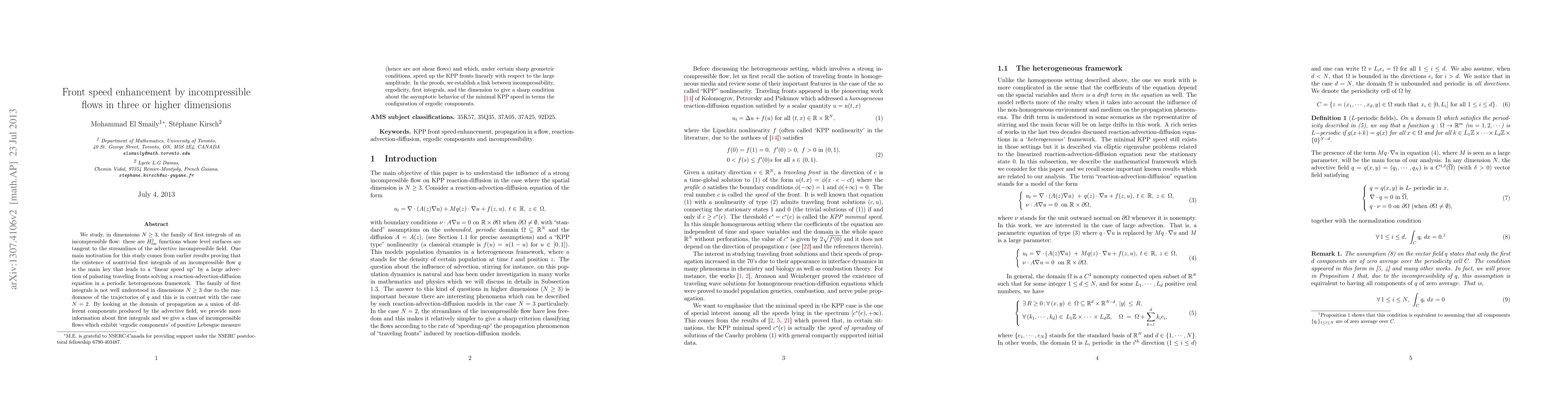 This paper investigates the existence and properties of first integrals in incompressible flows in dimensions $N\geq 3$, showing how they can lead to a linear speed enhancement of pulsating traveling fronts. It establishes a connection between incompressibility, ergodicity, and the dimension to determine the asymptotic behavior of the minimal speed for reaction-advection-diffusion equations.