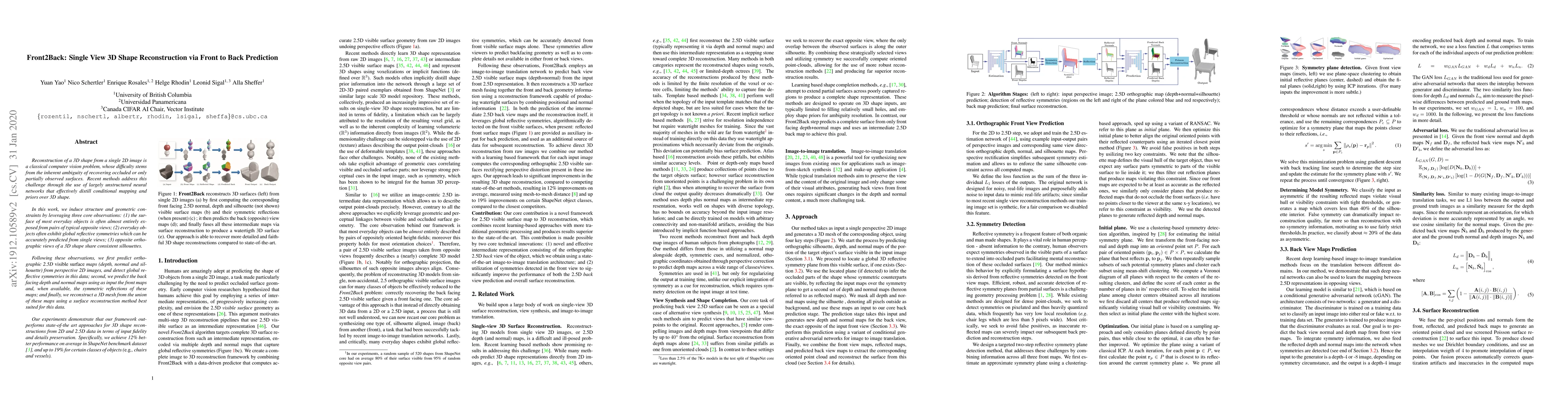 Reconstruction of a 3D shape from a single 2D image is a classical computer vision problem, whose difficulty stems from the inherent ambiguity of recovering occluded or only partially observed surfaces. Recent methods address this challenge through the use of largely unstructured neural networks that effectively distill conditional mapping and priors over 3D shape. In this work, we induce structure and geometric constraints by leveraging three core observations: (1) the surface of most everyday objects is often almost entirely exposed from pairs of typical opposite views; (2) everyday objects often exhibit global reflective symmetries which can be accurately predicted from single views; (3) opposite orthographic views of a 3D shape share consistent silhouettes. Following these observations, we first predict orthographic 2.5D visible surface maps (depth, normal and silhouette) from perspective 2D images, and detect global reflective symmetries in this data; second, we predict the back facing depth and normal maps using as input the front maps and, when available, the symmetric reflections of these maps; and finally, we reconstruct a 3D mesh from the union of these maps using a surface reconstruction method best suited for this data. Our experiments demonstrate that our framework outperforms state-of-the art approaches for 3D shape reconstructions from 2D and 2.5D data in terms of input fidelity and details preservation. Specifically, we achieve 12% better performance on average in ShapeNet benchmark dataset, and up to 19% for certain classes of objects (e.g., chairs and vessels).