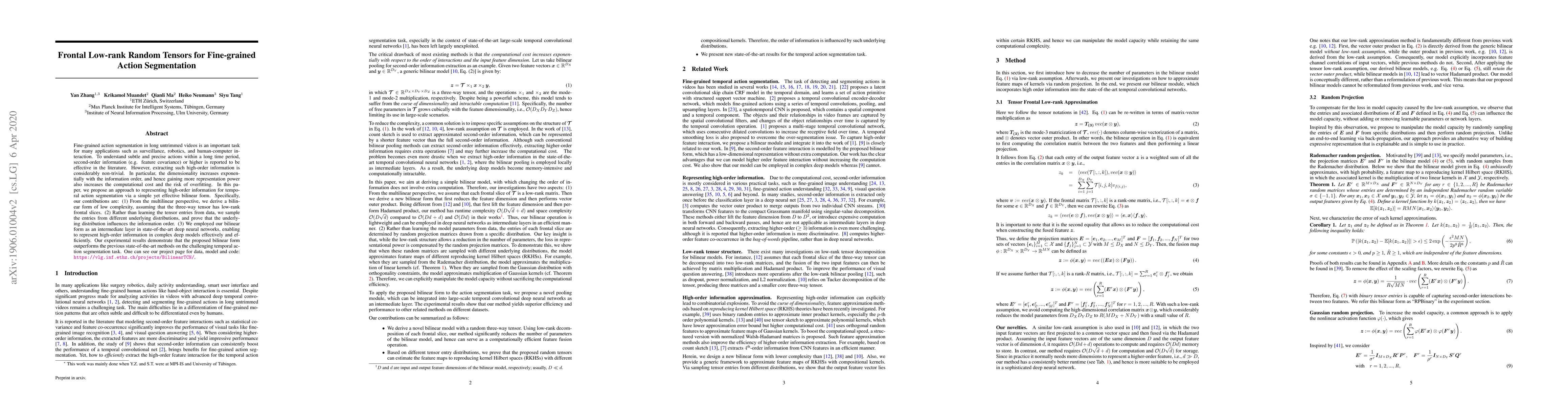 This paper proposes a low-rank bilinear form for representing high-order information in temporal action segmentation, addressing the challenges of computational cost and overfitting. The approach samples tensor entries from different distributions to infer higher-order information efficiently and integrates it into deep neural networks, achieving superior performance over previous methods.