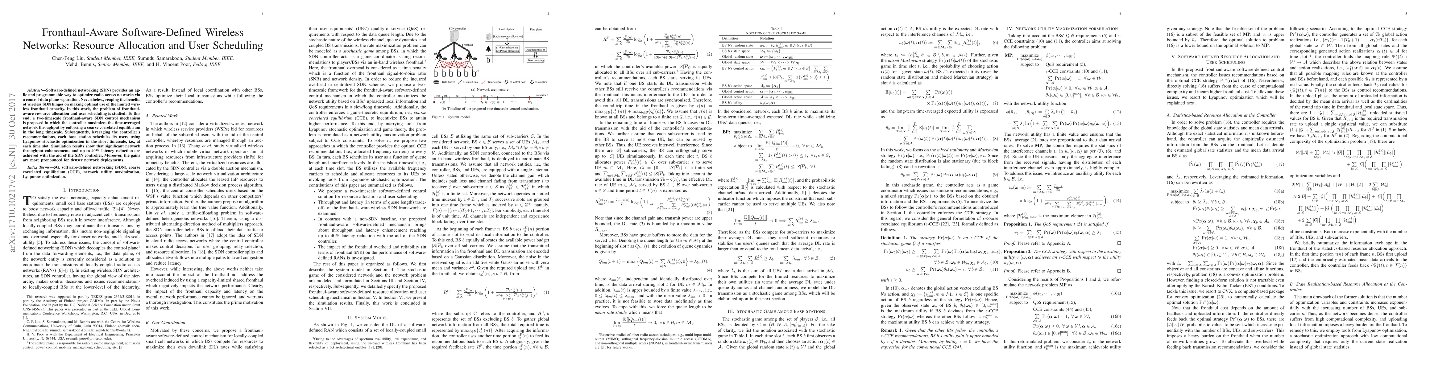 This paper proposes a two-timescale fronthaul-aware SDN control mechanism for optimizing resource allocation and user scheduling in wireless networks. The controller maximizes time-averaged throughput via a correlated equilibrium, while base stations use Lyapunov stochastic optimization for short-term user scheduling, achieving significant throughput improvements and latency reductions.