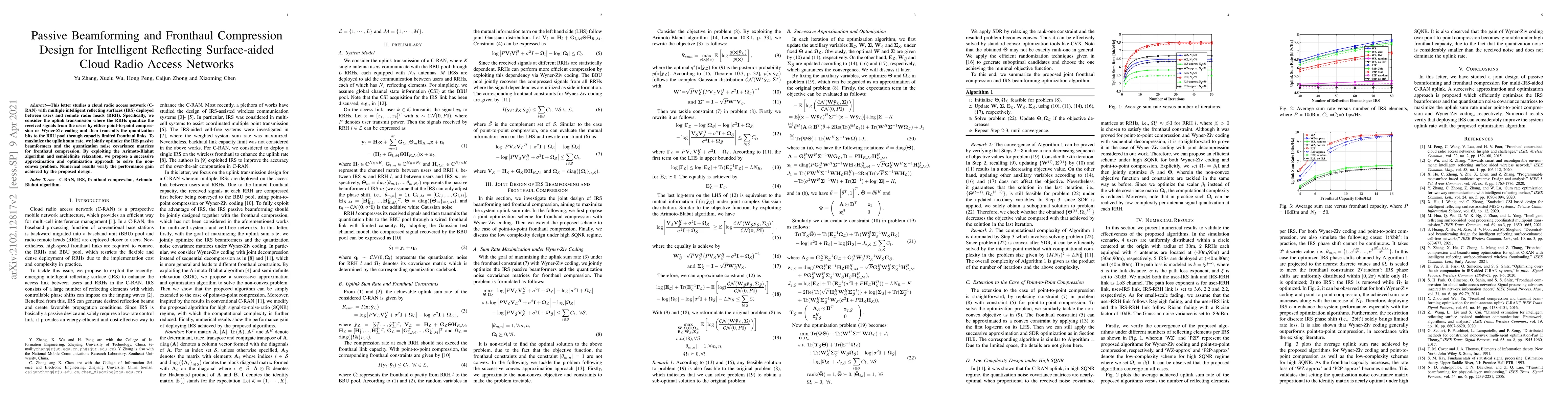 This paper proposes a method for optimizing uplink transmission in C-RAN with IRSs by jointly designing fronthaul compression and passive beamforming to maximize the sum rate. The Arimoto-Blahut algorithm and SDR are used to achieve this optimization, demonstrating performance gains through numerical results.